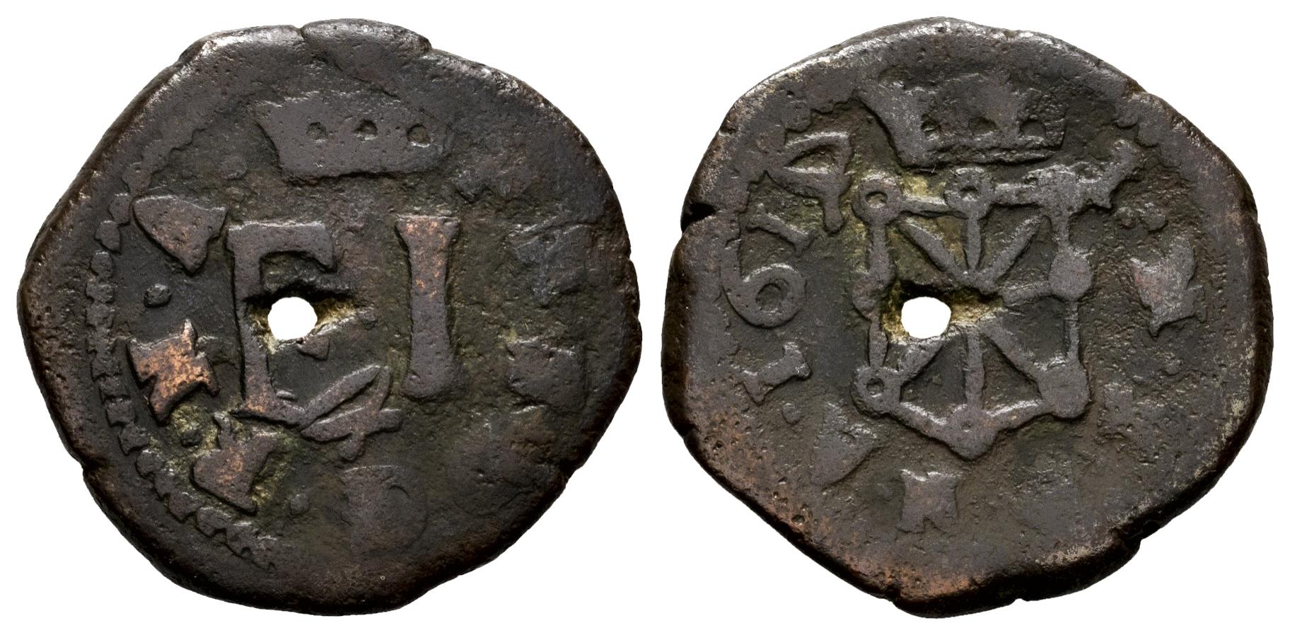 Philip III (1598-1621). 4 cornados. 1614. Pamplona. (Cal-73). (Ros-4.4.23). Anv.:  · P · H · S · D G · R · N · A · . Rev.: Shield of Navarre crowned. · I · N · S · A · N ·A · I 6 I 4. Ae. 4,28 g. The 4 of the date is lying down. Central puncture, desmonetized?. Scarce. Almost VF. Est...30,00.