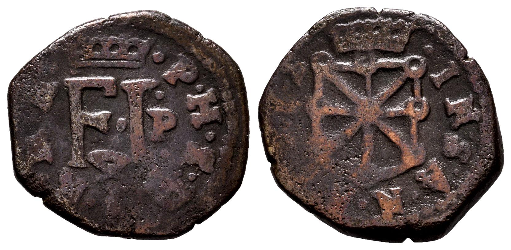 Philip III (1598-1621). 4 cornados. 1615. Pamplona. (Cal-73). (Ros-4.4.25 var.). Anv.: FI with P on the right, bounded vertically by pellets. · P · H · S · D · (G) · R · N · A · . Rev.: Shield of Navarre crowned. · I N · S · A · N · A ... I 5. Ae. 3,51 g. Almost VF. Est...30,00.