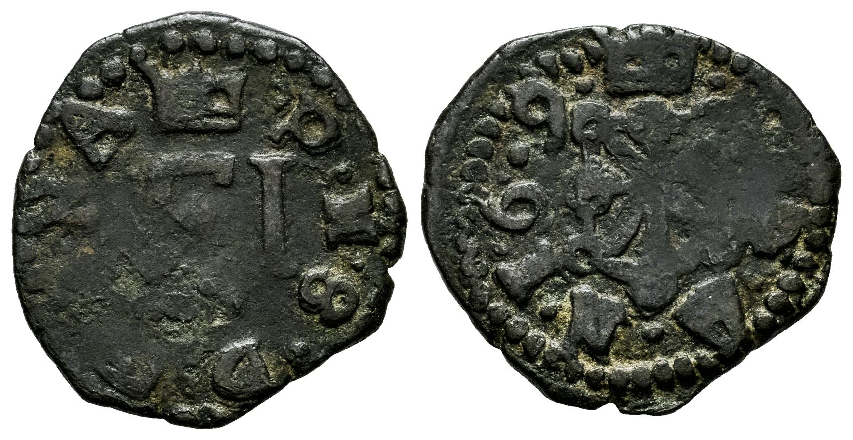 Philip III (1598-1621). 4 cornados. 1609 (1·6·9). Pamplona. (Cal-75). (Ros-4.4.14 var.). Anv.: P · H · S · D · G (· R ·) N · A . Rev.: · ( I · N) · S · A · N · I · 6 · 9 · . Ae. 3,15 g. Almost VF. Est...25,00.