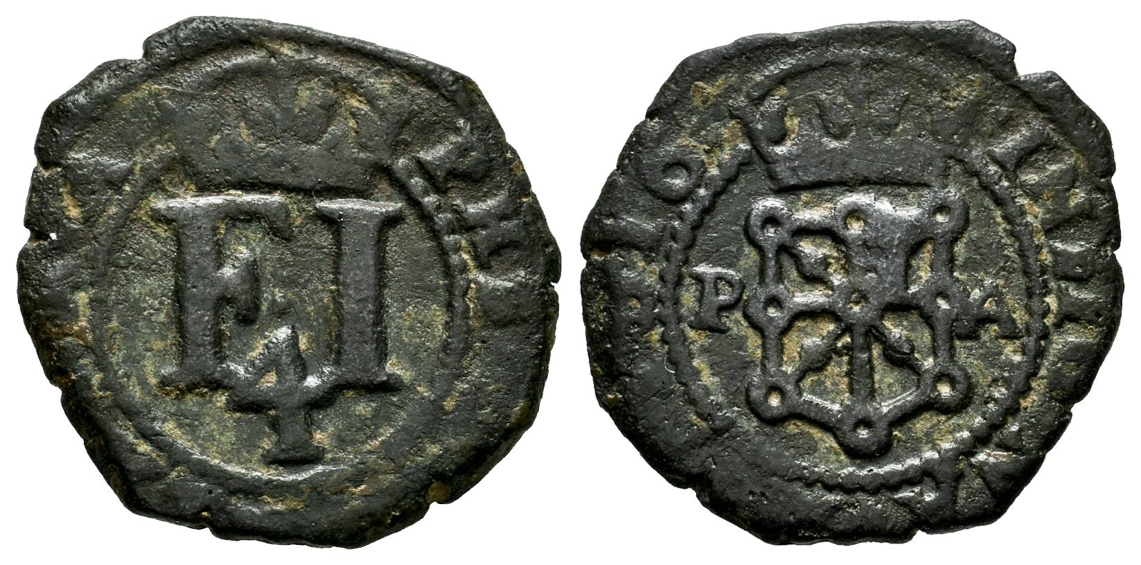 Philip III (1598-1621). 4 cornados. 1616. Pamplona. (Cal-76). (Ros-4.4.27). Anv.: P H S · ... AVA ·. Rev.: Shield of Navarre crowned, between P-A. · I N S I G · N A V ... I 6 I 6. Ae. 3,48 g. Ex Álvarez de Toledo collection, Lot 1111 (08/06/2021)