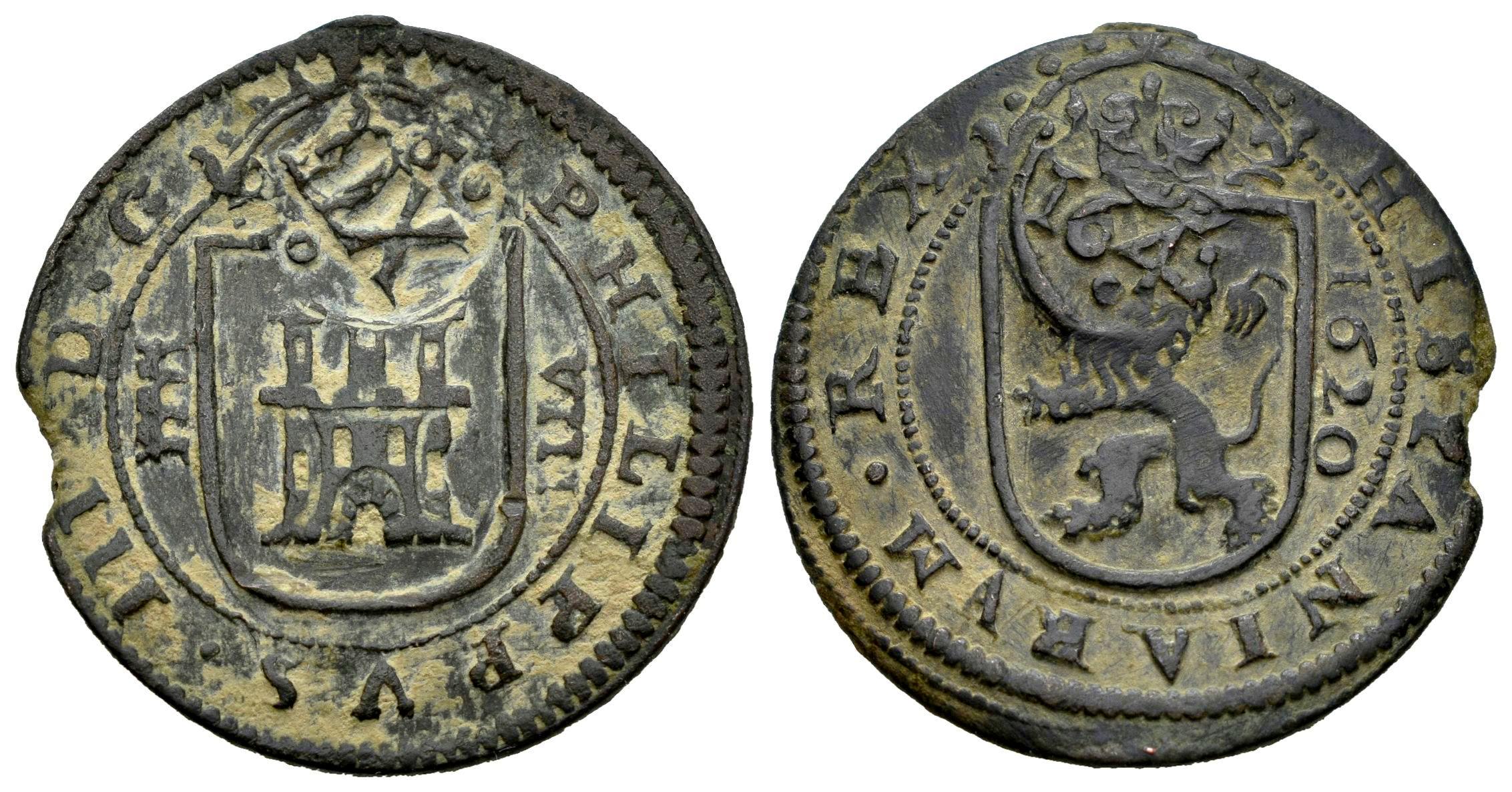 Philip IV (1621-1665). 12 maravedis. 1641. Toledo. (Cal-517). (Jarabo-Sanahuja-H39). Ae. 6,33 g. Counterstamped on 8 maravedís of Segovia 1620. Choice VF. Est...35,00.