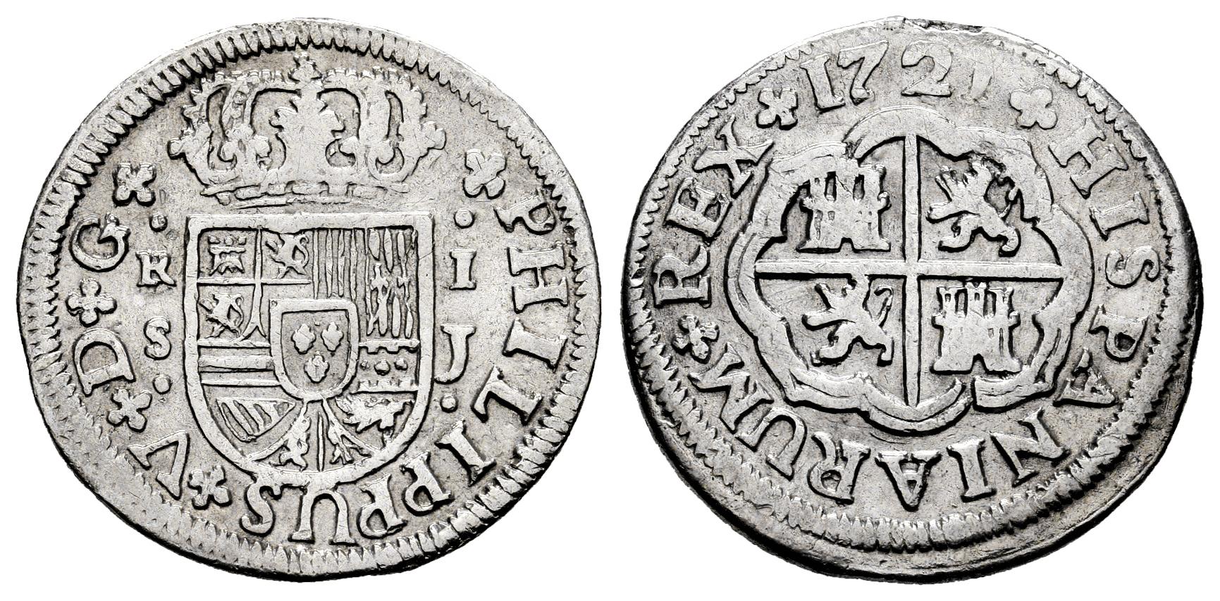 Philip V (1700-1746). 1 real. 1721. Sevilla. J. (Cal-645). Ag. 2,44 g. Traces of welding at 12 o´clock on edge. Almost VF. Est...20,00.