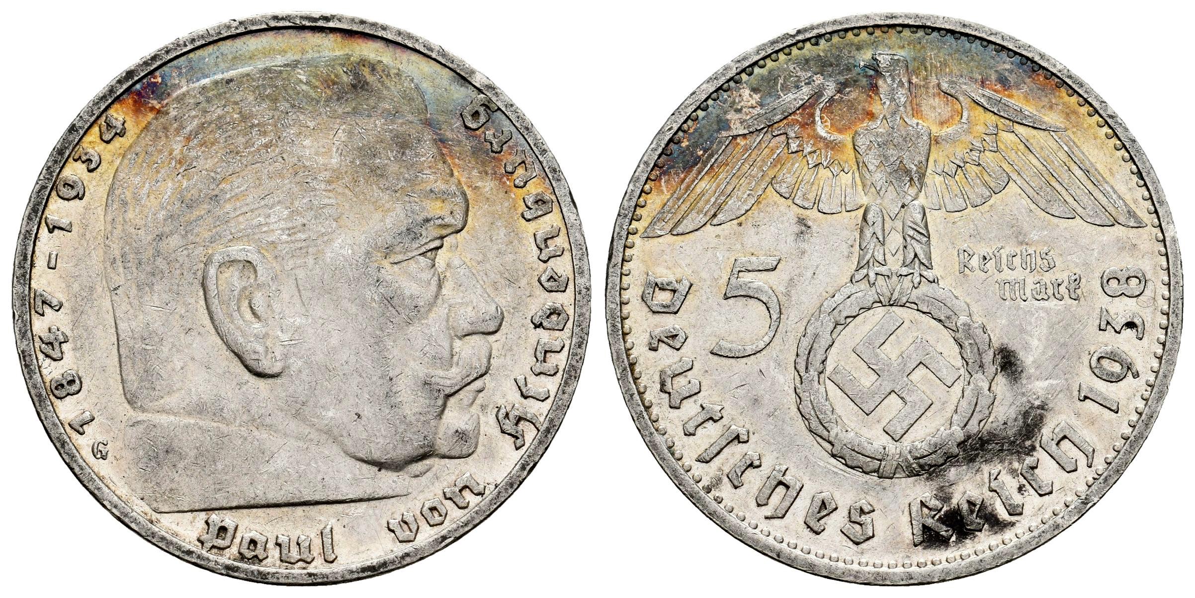 Germany. Third Reich. 5 reichsmark. 1938. Karlsruhe. G. (Km-94). Ag. 13,87 g. Minor scratches. Traces of luster. Slight iridescent tone. XF/Almost XF. Est...35,00.