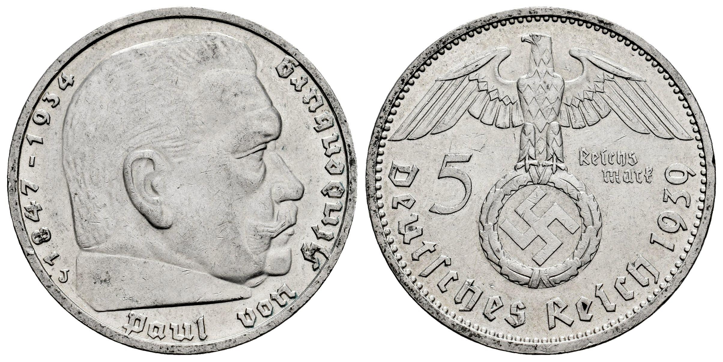 Germany. Third Reich. 5 reichsmark. 1939. Hambourg. J. (Km-94). Ag. 13,92 g. Traces of luster. XF. Est...25,00.
