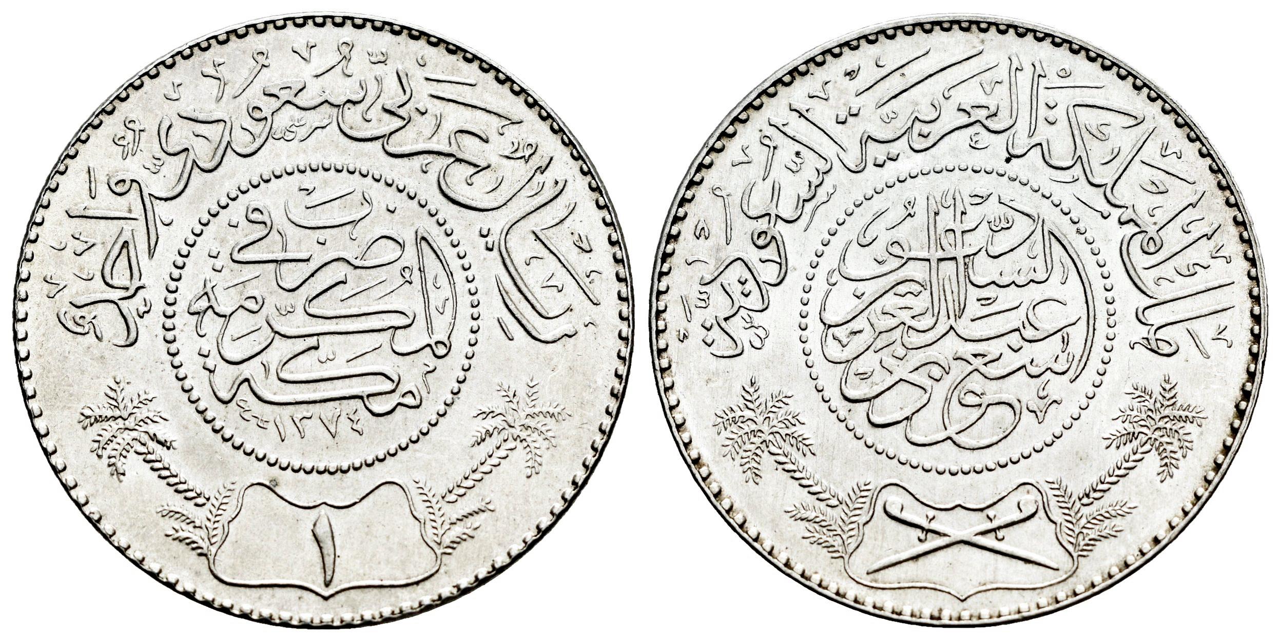 Arabia. Sa´ud bin Abd Al-Aziz. 5 rials. 1374 H (1954). (Km-39). Ag. 11,71 g. Plenty of original luster. Mint state. Est...25,00.