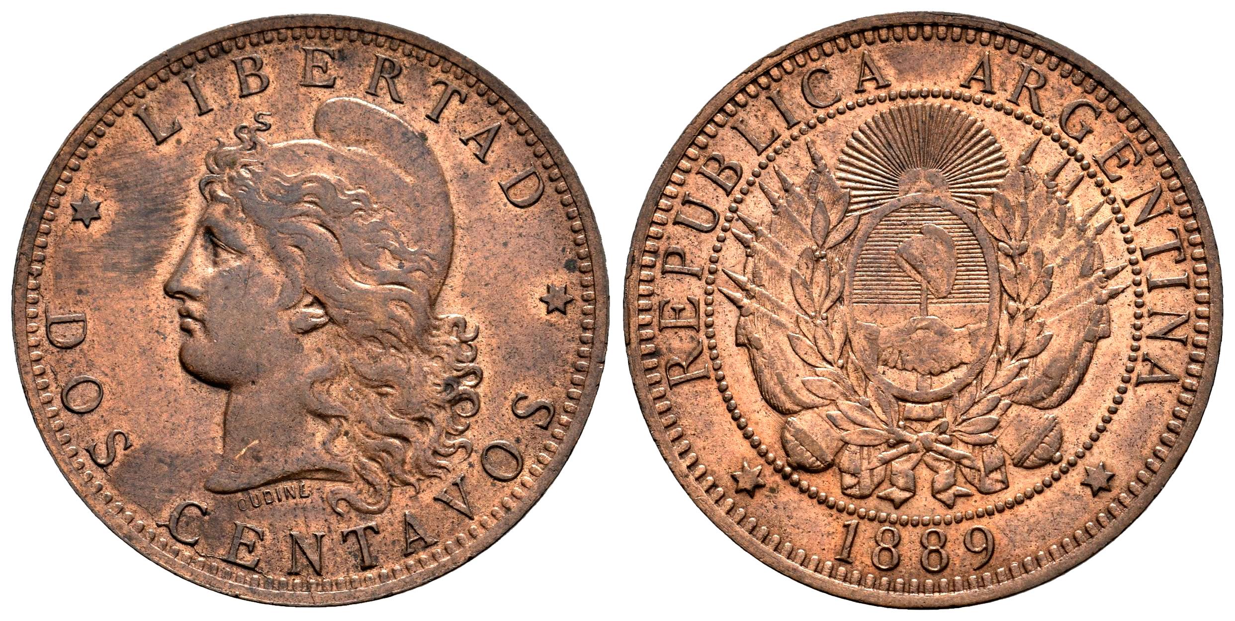 Argentina. 2 centavos. 1889. (Km-33). Au. 9,86 g. Traces of luster. XF. Est...30,00.