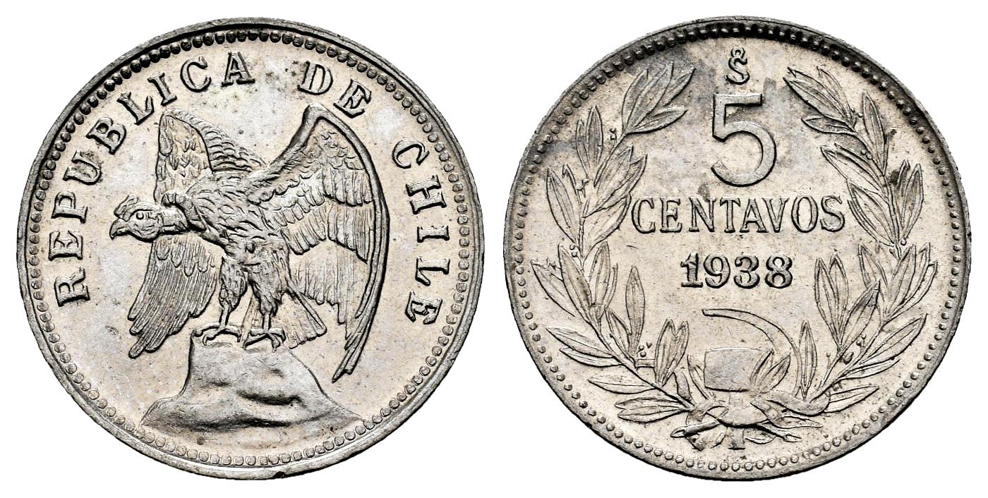 Chile. 5 centavos. 1938. Santiago. (Km-165). 1,98 g. Plenty of original luster. Mint state. Est...15,00.