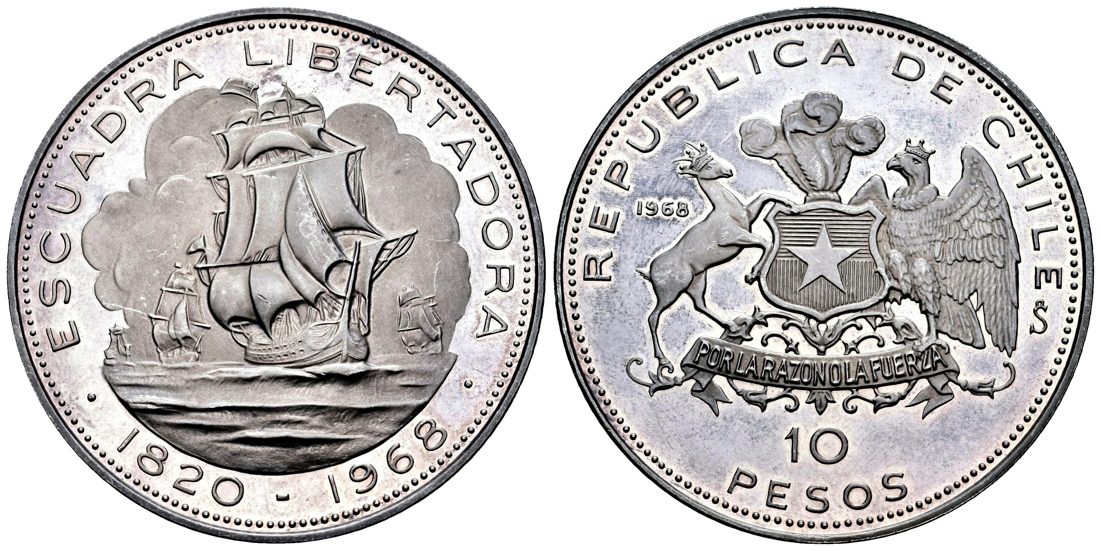 Chile. 10 pesos. 1968. Santiago. (Km-183). Ag. 44,47 g. 45 mm. Arrival of the Liberation Squadron in 1820 under the command of Lord Cochrane. PROOF. Est...120,00.