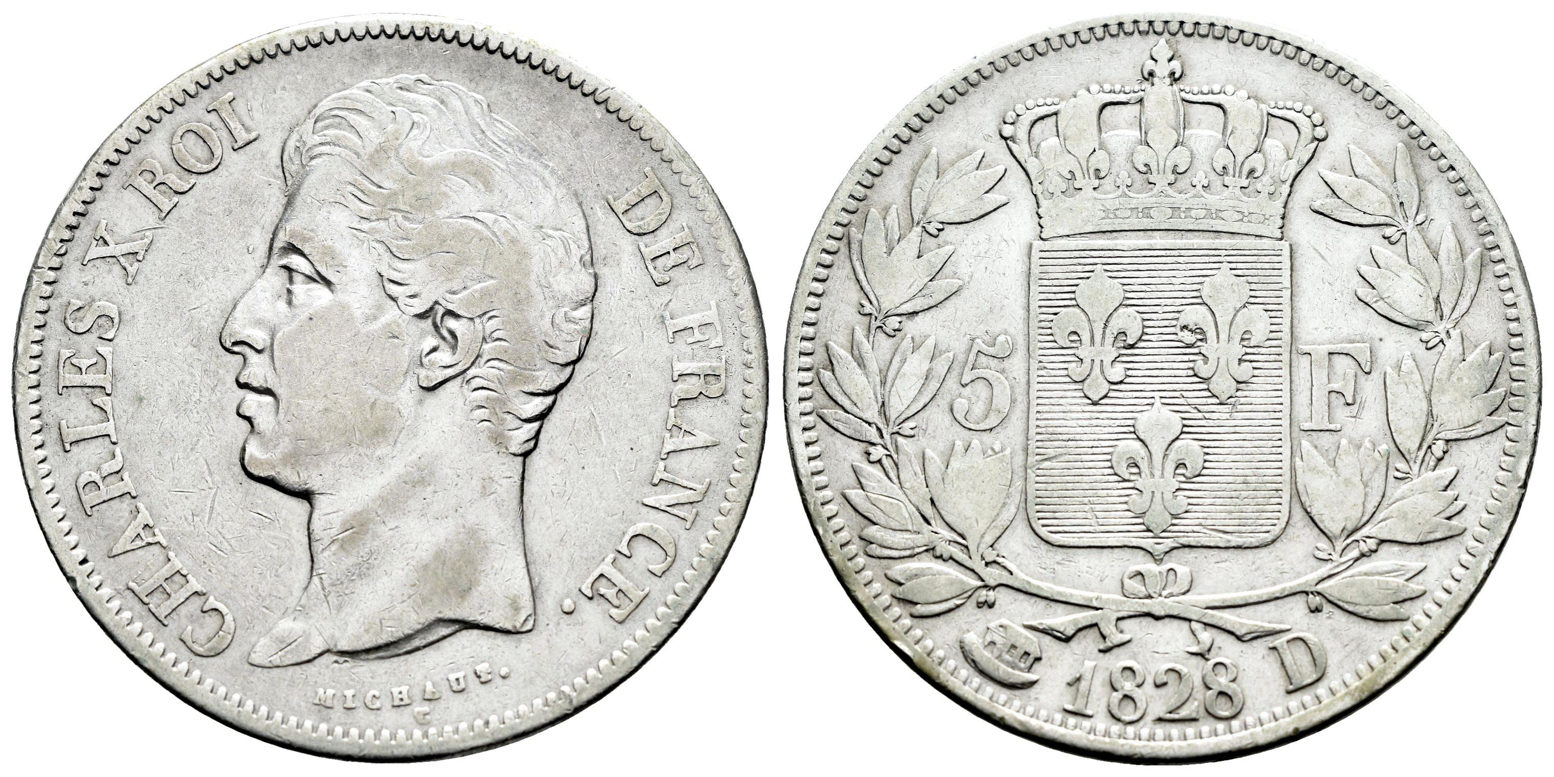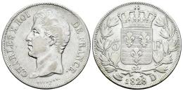 France. Charles X. 5 francs. 1828. Lyon. D. (Km-728.4). (Gad-644). Ag. 24,60 g. Cleaned. Choice F. Est...20,00.