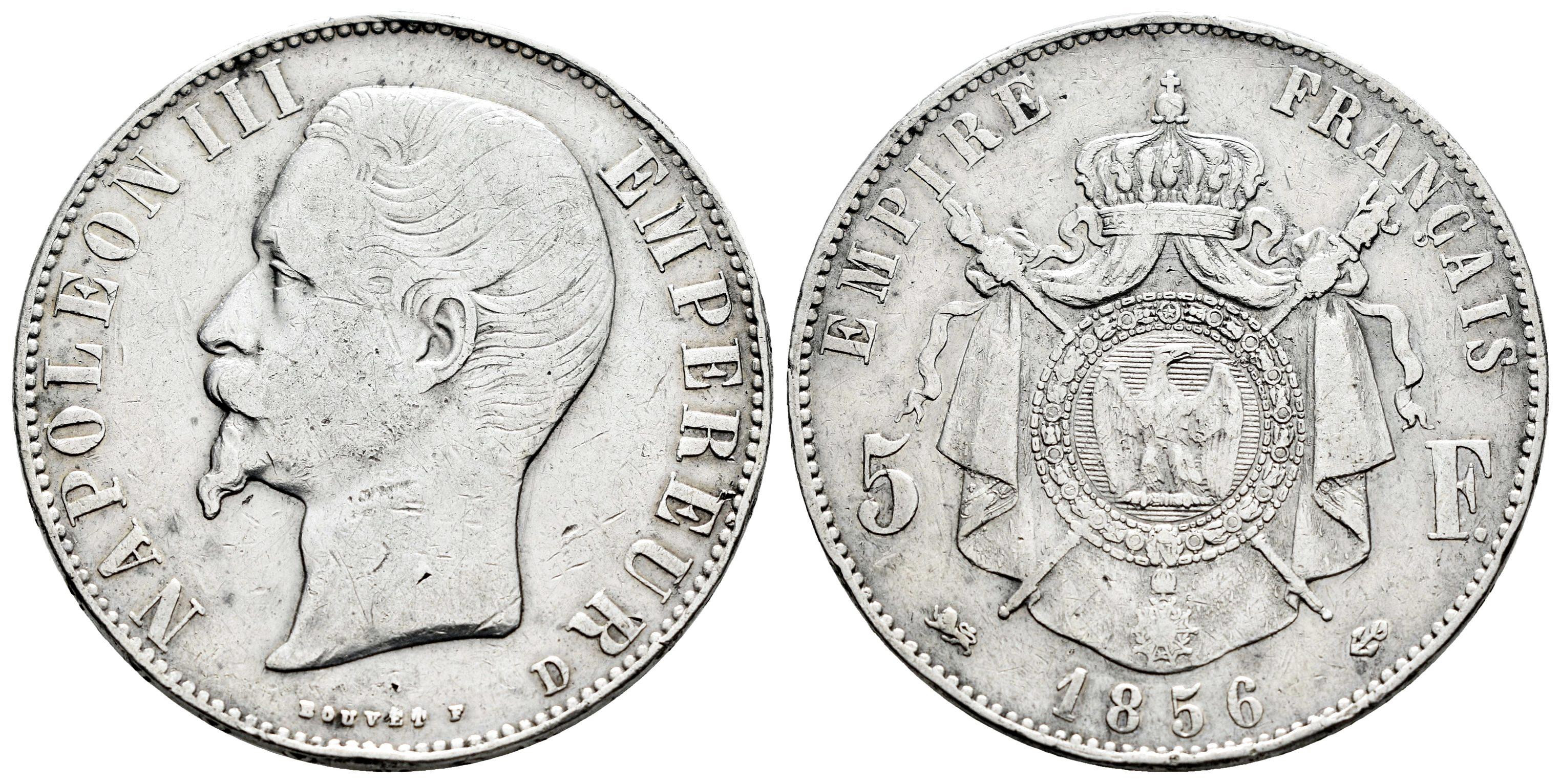France. Napoleon III. 5 francs. 1856. Lyon. D. (Km-782.3). (Gad-734). Ag. 24,96 g. Cleaned. F. Est...25,00.