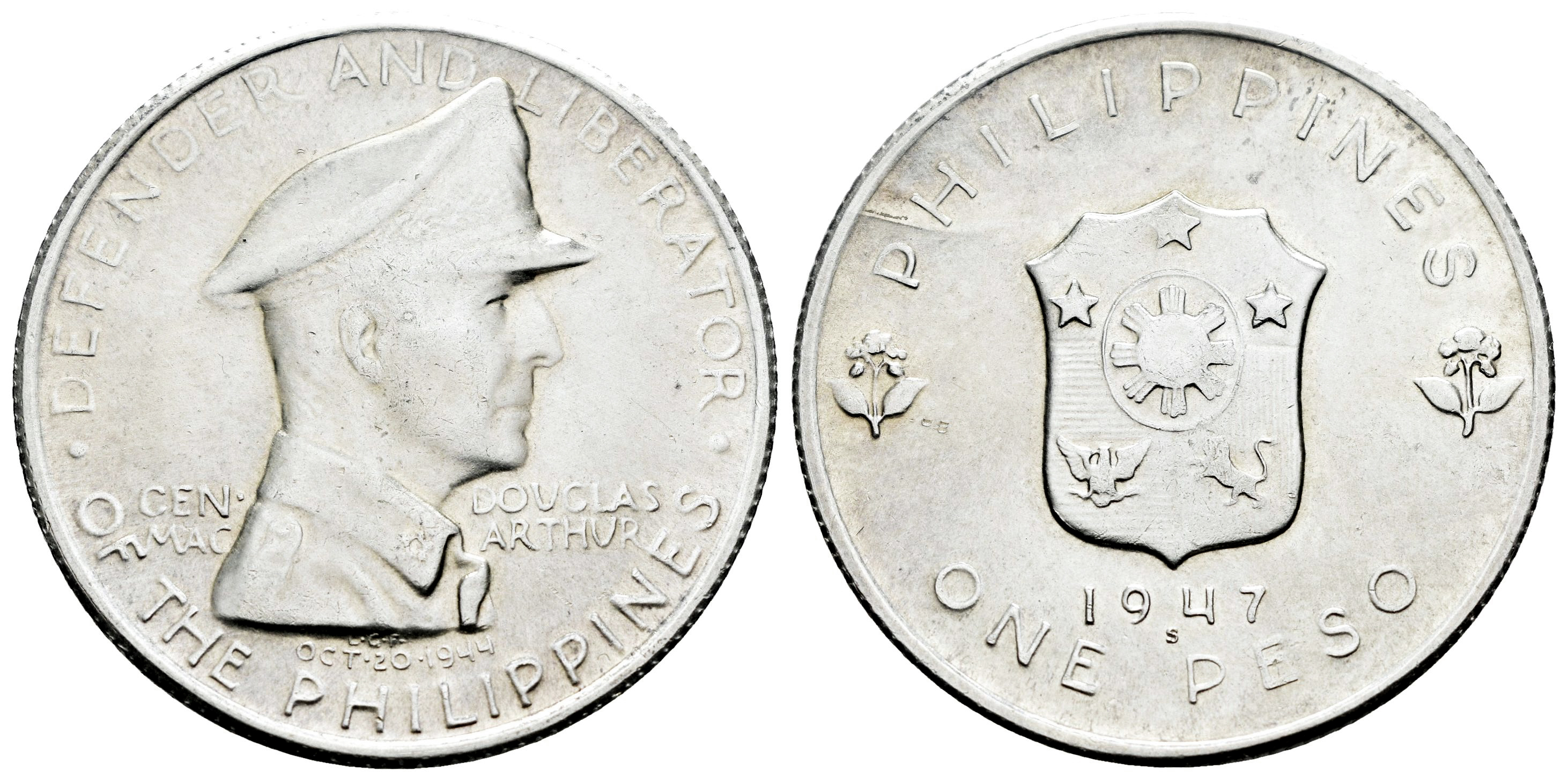 Philippines. 1 peso. 1947. (Km-185). Ag. 20,00 g. Douglas MacArthur Centennial. Original luster. Almost MS. Est...45,00.