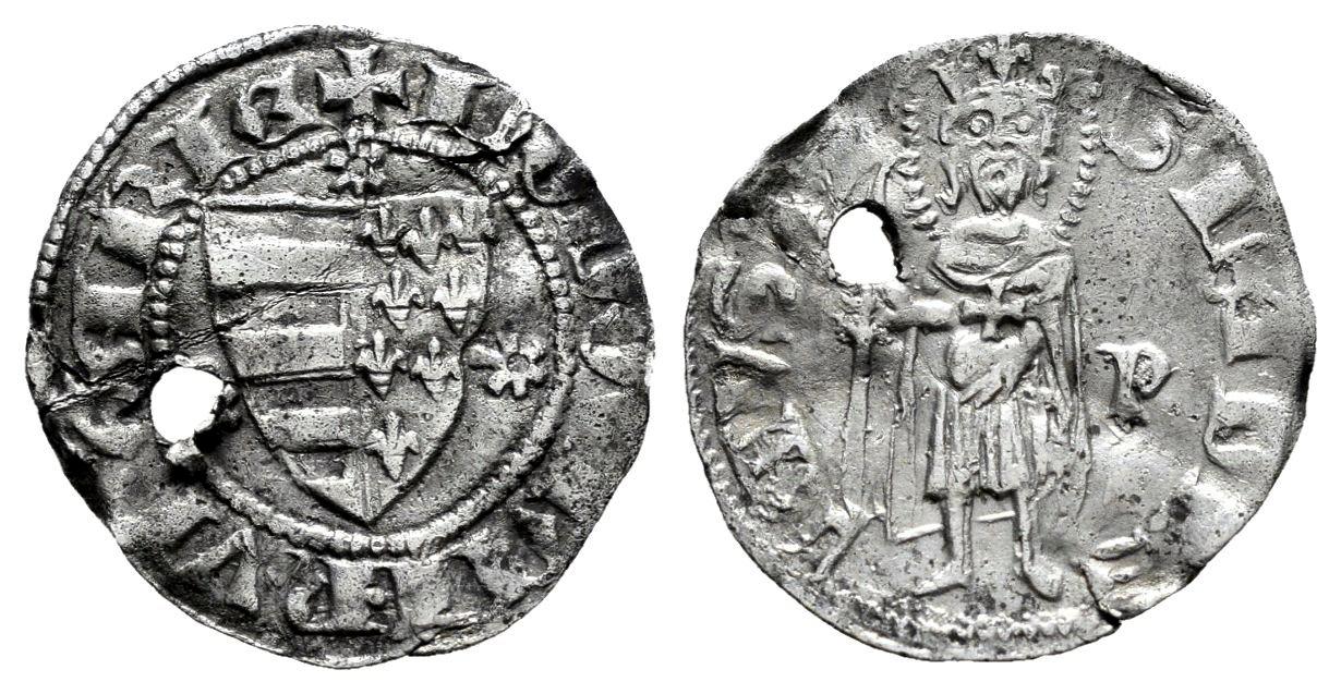 Hungary. Louis I (1342-1382). Dinero. P. (EH-429i). Anv.: + LODOVICI · R · hVnGΛRIЄ. Coat-of-arms; three crosses around. Rev.: S LADIS LAVS R. Saint standing facing, holding halberd and orb; P to right. Ag. 0,46 g. Puncture. VF. Est...40,00.