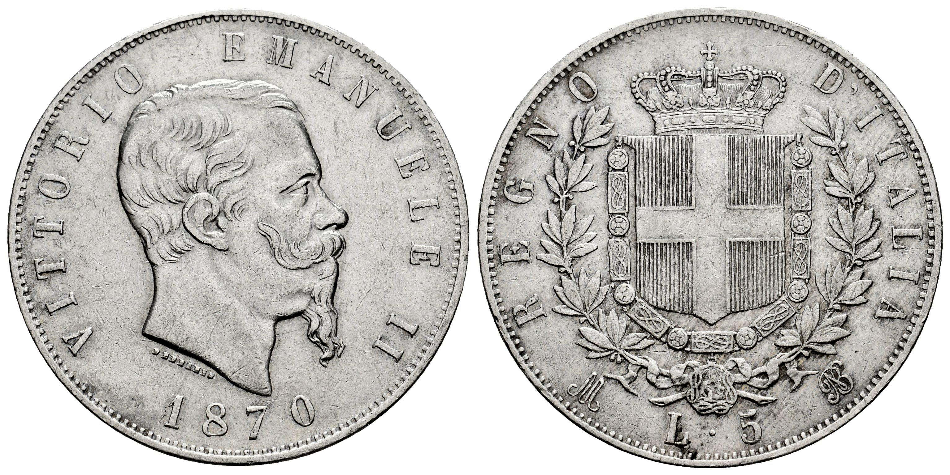 Italy. Vittorio Emanuele II. 5 lire. 1870. Milano. BN. (Km-8.3). (Pagani-490). (Mont-172). Ag. 24,94 g. Delicate cleaning. Choice VF. Est...45,00.