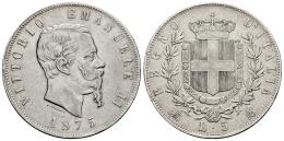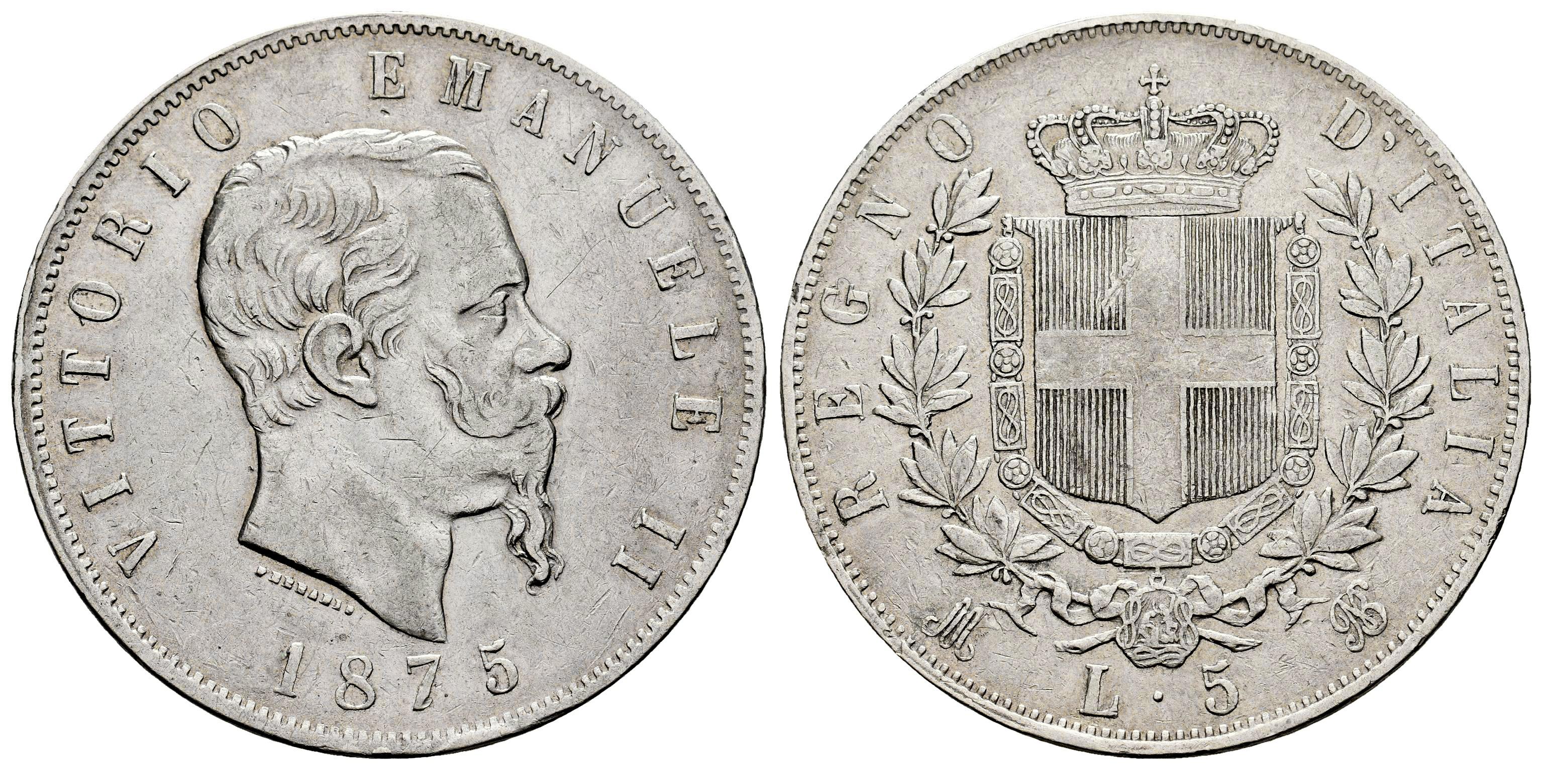 Italy. Vittorio Emanuele II. 5 lire. 1875. BN. (Km-8.3). (Pagani-499). (Mont-184). Ag. 24,88 g. Minor scratches. Nicks on edge. Delicate cleaning. Choice VF. Est...45,00.