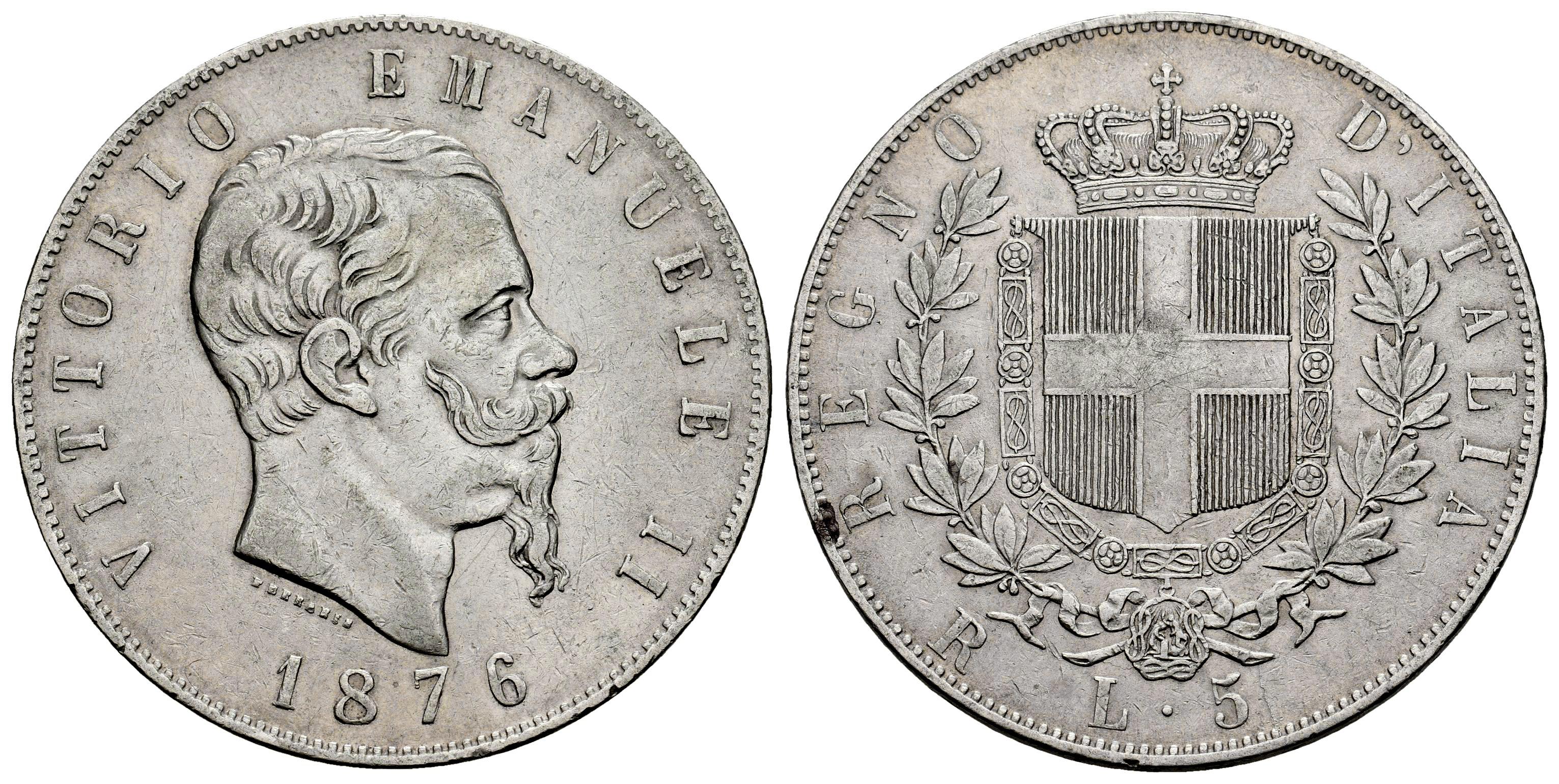 Italy. Vittorio Emanuele II. 5 lire. 1876. Rome. R. (Km-8.4). (Pagani-501). (Mont-188). Ag. 24,95 g. Delicate cleaning. Choice VF. Est...45,00.