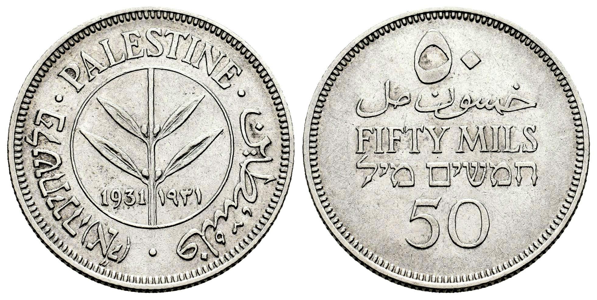 Palestine. 50 mils. 1931. Tower Hill (London). (Km-6). (Schön-6). Ag. 5,81 g. Almost XF/Choice VF. Est...90,00.