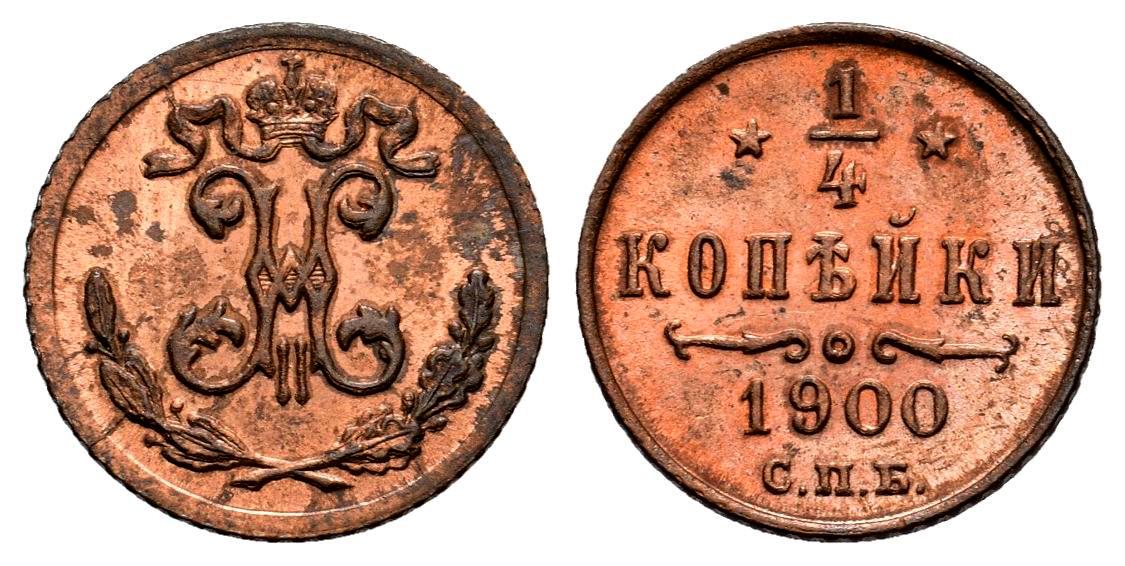 Russia. Nicholas II (1894-1917). 1/4 kopeck. 1900. Saint Petesburg. (Km-Y47.1). Ae. 0,81 g. Original luster. Almost MS. Est...80,00.