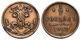 Russia. Nicholas II (1894-1917). 1/2 kopek. 1897. Moscow. (Km-Y#48.1). (Bitkin-293). Ae. 1,66 g. Cleaned. VF. Est...15,00.