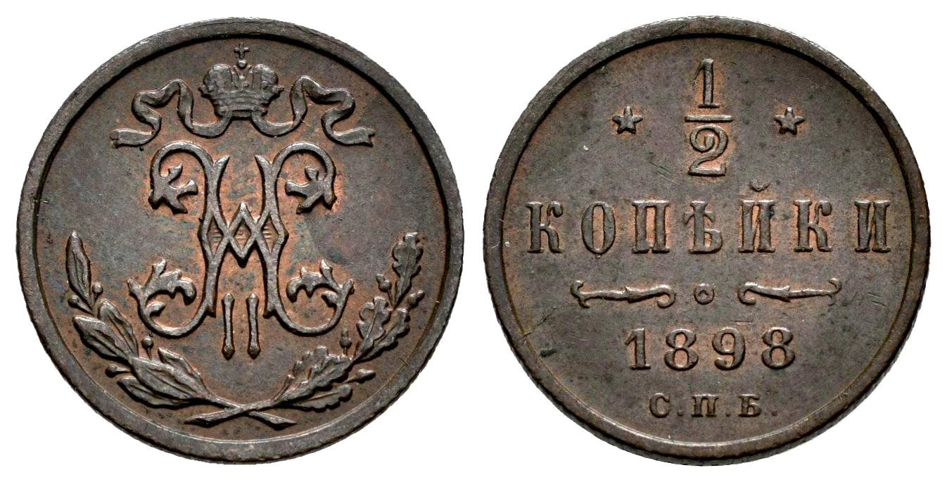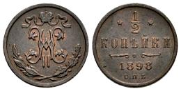 Russia. Nicholas II (1894-1917). 1/2 kopek. 1898. Saint Petesburg. CПБ. (Km-Y48.1). (Bitkin-294). Ae. 1,63 g. XF. Est...25,00.