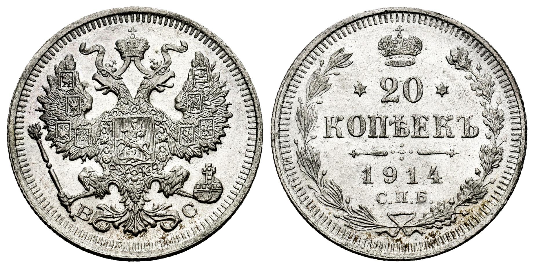Russia. Nicholas II (1894-1917). 20 kopecks. 1914. Saint Petesburg. CПБ-BC. (Km-Y#22a.2). (Bitkin-116). Ag. 3,76 g. Traces of luster. AU. Est...35,00.
