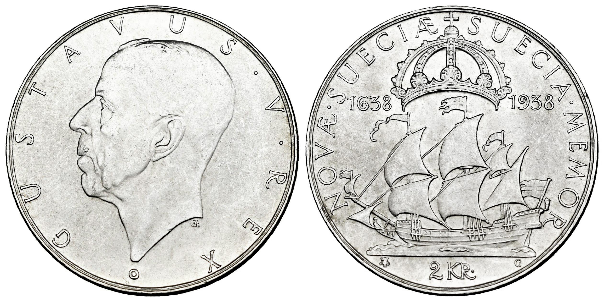 Sweden. Gustaf V. 1938. (Km-807). Ag. 15,03 g. 300th Anniversary of the Founding of New Sweden. Mint state. Est...25,00.