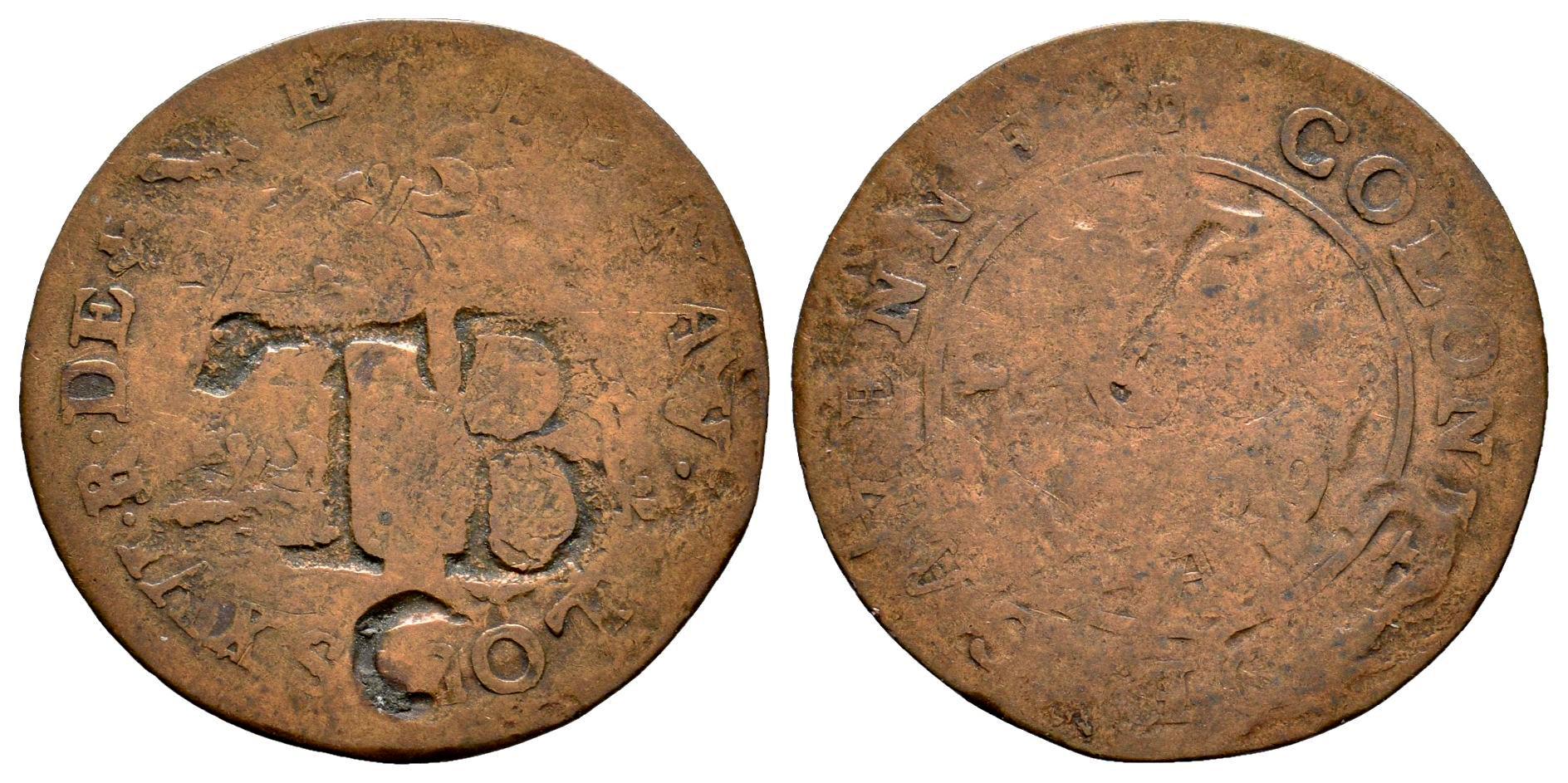 Occupied by France. ND (1791-1803). (Km-19.6). Bi. TB countermark on a 2 Sous de Cayenne coin. Rare. Choice F. Est...30,00.