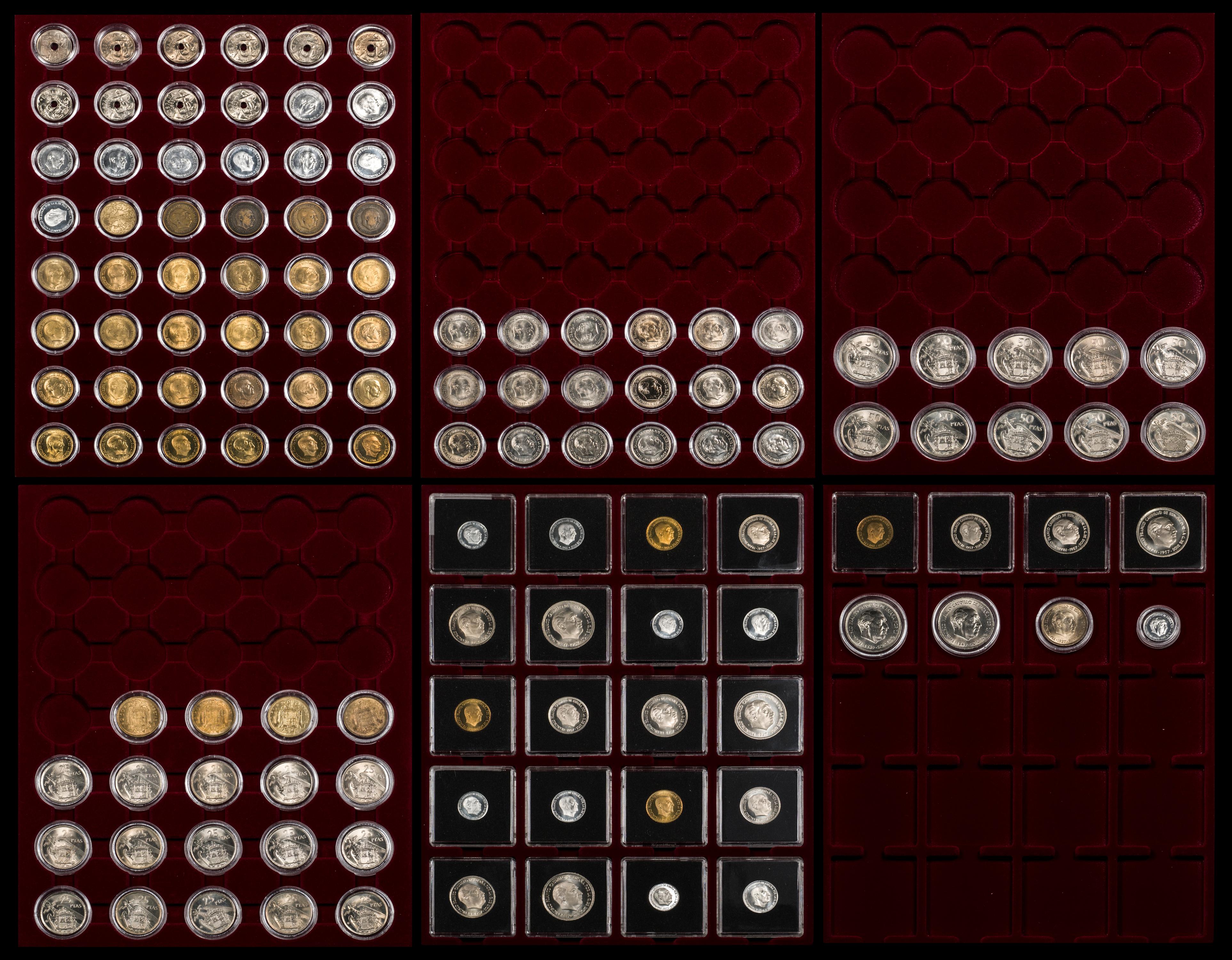 Collection of 123 coins from Spanish State (1936-1975), housed in Leuchtturm trays; complete series of 50 céntimos (1949), complete series of 50 céntimos (1966), complete series of 1 peseta (1947 and 1966), lacking the patterns; complete 2.50 pesetas series, lacking the pattern and star dates 68 and 69; complete series of 5 pesetas (1957); complete series of 25 pesetas (1957); complete series of 50 pesetas (1957), lacking star dates 68 and 69 and not including the “una libre grande” variety. Also includes the coins from the official mint sets (“carteritas”) of 1972, 1973, 1974, and 1975. It is essential a rigorous examination of the lot. ONLY SHIPPING TO SPAIN PENINSULA. NO RETURNS ALLOWED. VF/Mint state. Est...500,00.