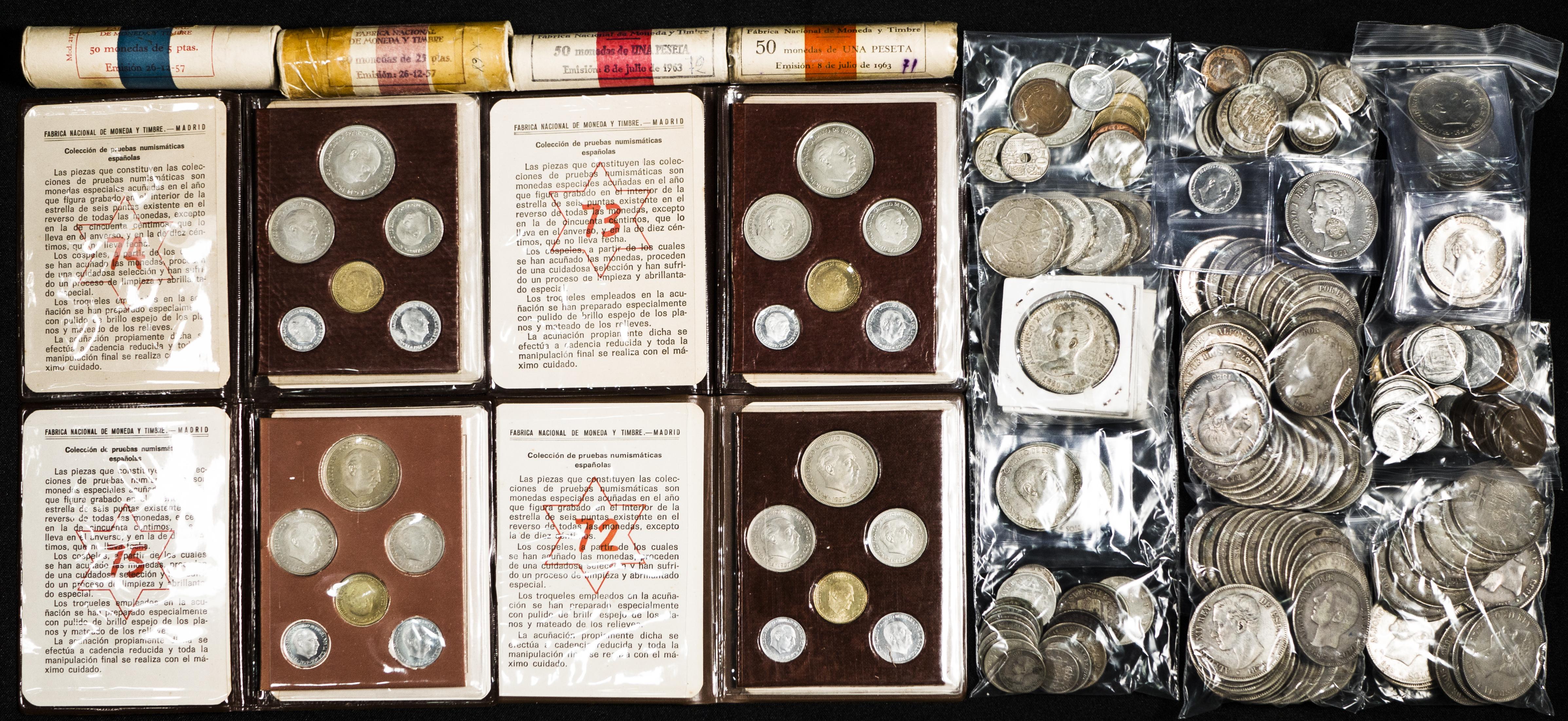 Lot of 192 coins, plus 4 bank rolls and 4 official mint sets; includes issues from the Peseta period, the Spanish State, and Juan Carlos I. Also includes some mint errors from the Spanish State period. It is essential a rigorous examination of the lot. ONLY SHIPPING TO SPAIN PENINSULA. NO RETURNS ALLOWED. F/AU. Est...500,00.