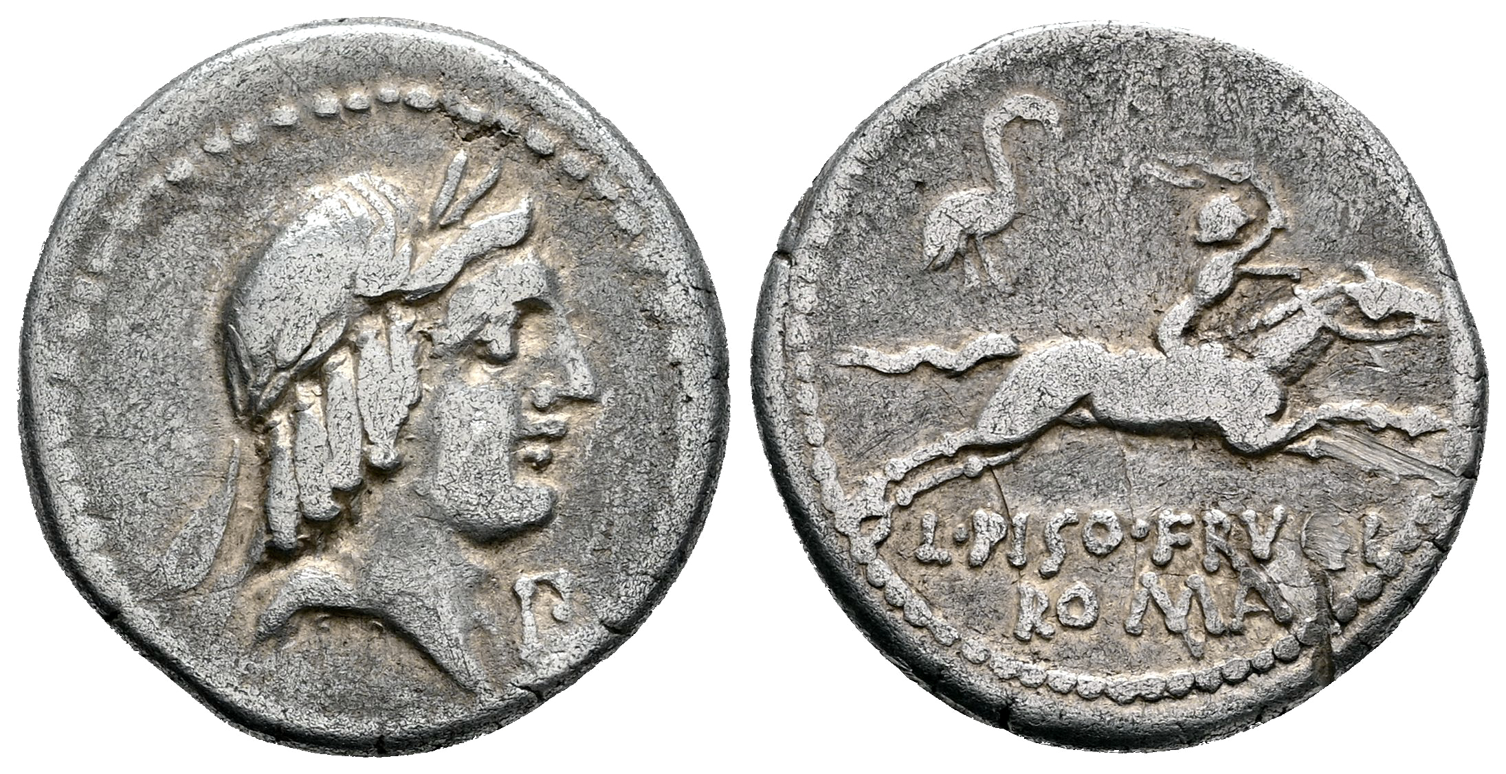 Calpurnius. L. Calpurnius Piso Frugi. Denarius. 90-89 BC. Rome. (Ffc-230). (Craw-no cita). (Tesorillo-Calpurnia 2, Plate Coin). Anv.: Laureate head of Apollo right, below chin letter. Rev.: Horseman galloping right, holding whip, ROMA below legend, L. PISO FRVGI., heron above horseman. Ag. 3,79 g. Test cut on reverse.  Rare. Ex Ancient Delights, at the present Mayor 25. Madrid Numismatic convention (July 2004). Almost VF. Est...100,00.