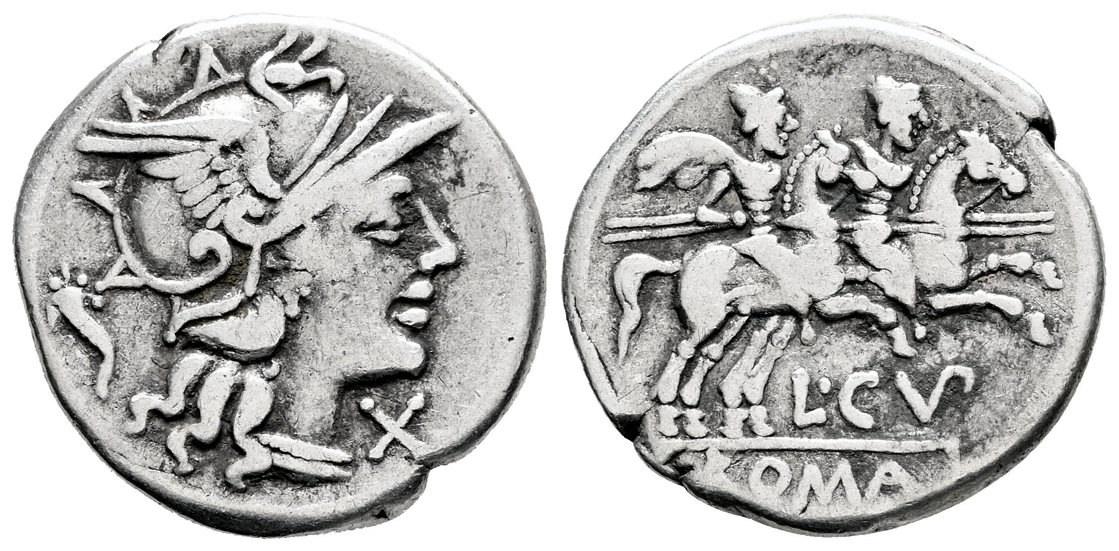 Cupiennius. L. Cupiennius. Denarius. 147 BC. Rome. (Ffc-665). (Craw-218/1). (Tesorillo-Cupiennia 1, Plate Coin). Anv.: Head of Roma right, X below chin, cornucopiac behind. Rev.: The Dioscuri right, stars above, L. CVP. (VP interlace) below horses, ROMA in exergue. Ag. 3,93 g. Ex J. Vico (March 2002), lot 1183. Almost VF. Est...85,00.