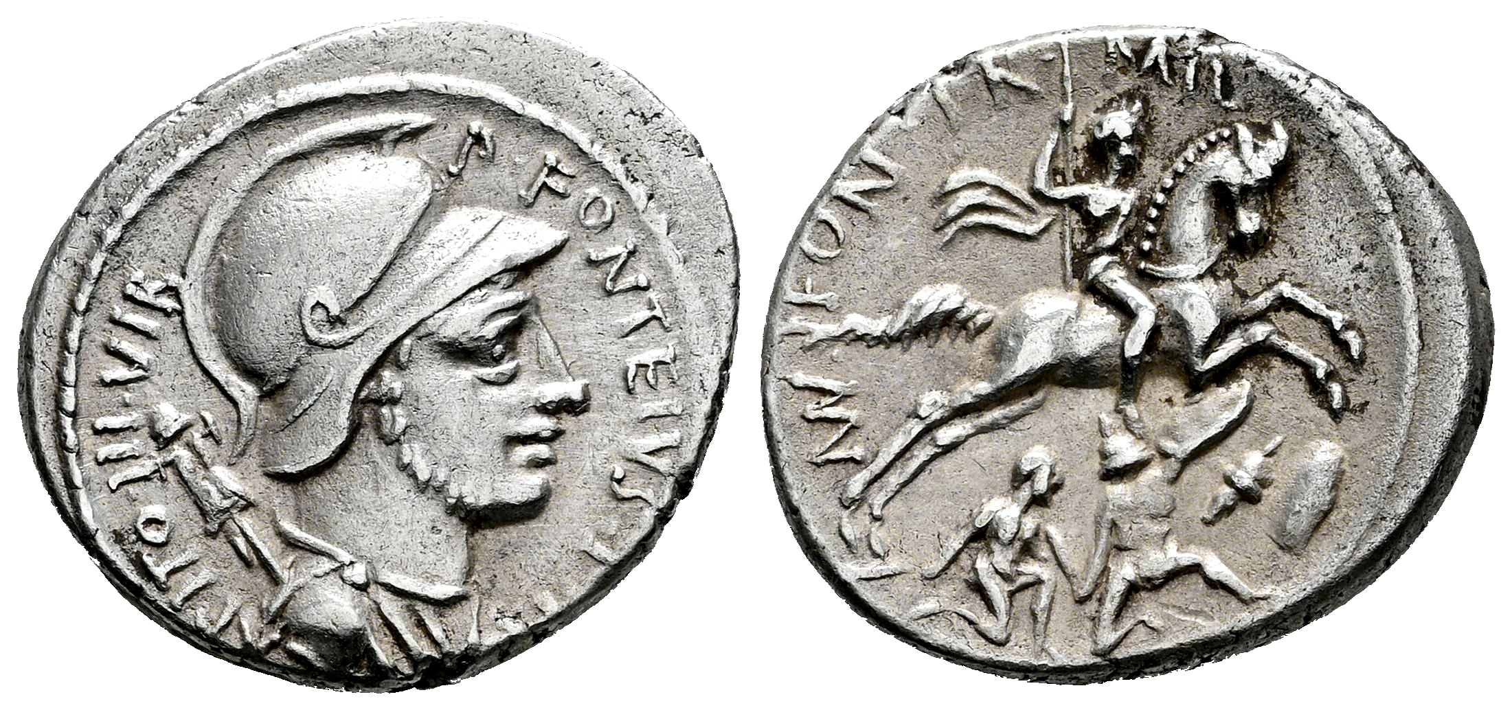 Fonteius. P. Fonteius P. f. Capito. Denarius. 55 BC. Rome. (Ffc-723). (Craw-429/1). (Tesorillo-Fonteia 3, Plate Coin). Anv.: P. FONTEIVS. P.F. CAPITO III. VIR., bust of Mars draped right, trophy behind. Rev.: MN. FONT. TR. MIL., (MN y NT interlace) above warrior on horseback thrusting his spear at Gaulish enemy who is about to slay a third combatant who is unarmed, helmet and oval shiel below on right. Ag. 3,91 g. Included original label. Almost XF. Est...200,00.