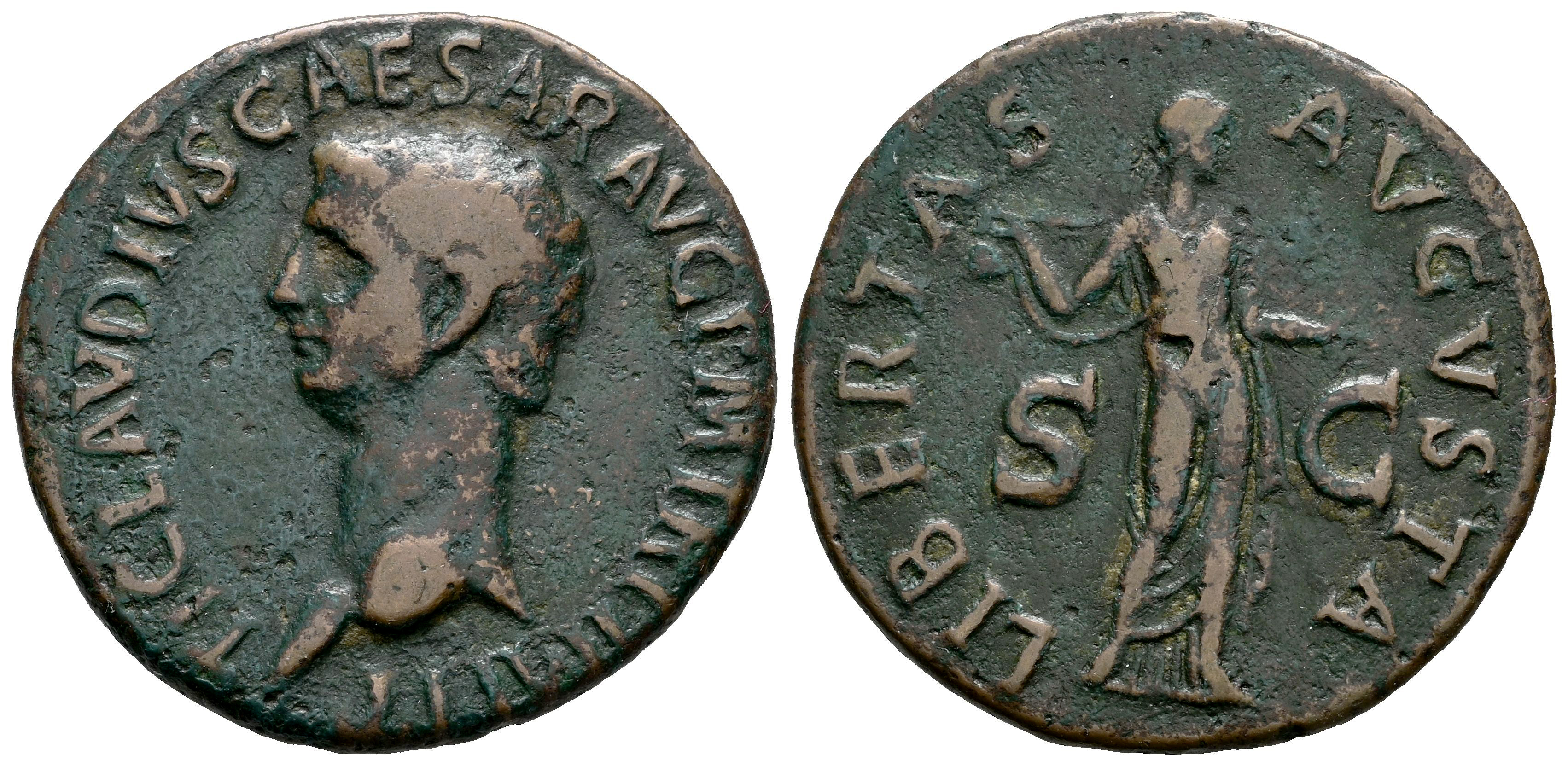 Claudius. Unit. 41-50 AD. Rome. (Ric-I 97). (Bmcre-145). (Tesorillo-Claudio 9, Plate Coin). Anv.: TI CLAVDIVS CAESAR AVG P M TR P IMP, bare head to left. Rev.: LIBERTAS AVGVSTA, Libertas standing facing, head to right, holding pileus and extending hand; S-C across fields. Ae. 9,41 g. Ex J. Vico 103 (13/11/2003), lot 226. Almost VF. Est...90,00.
