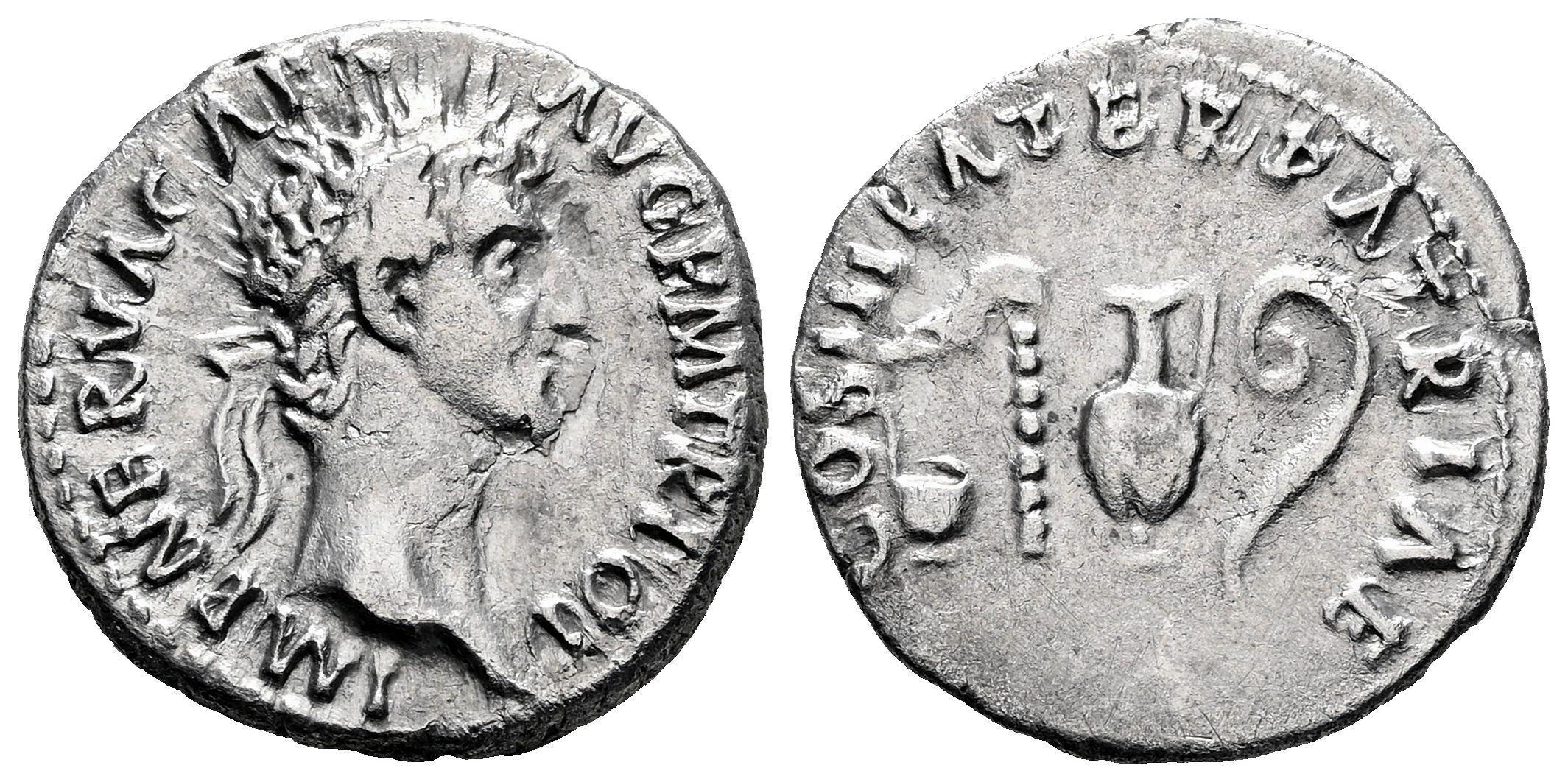 Nerva. Denarius. 97 AD. Rome. (Ric-II 24). (Bmcre-33). (Tesorillo-Nerva 1, Plate Coin). Anv.: IMP NERVA CAES AVG P M TR POT, laureate head to right. Rev.: COS III PATER PATRIAE, priestly emblems: simpulum, sprinkler, ewer, and lituus. Ag. 3,09 g. VF. Est...140,00.