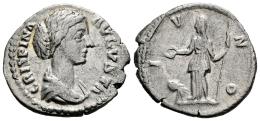 Crispina. Denarius. 178-182 AD. Rome. (Ric-III 283). (Bmcre-41). (Tesorillo-Crispina 2, Plate Coin). Anv.: CRISPINA AVGVSTA, bare-headed and draped bust to right. Rev.: IVNO, Juno standing facing, head to left, holding patera in extended right hand and vertical sceptre in left; peacock standing to left in left field. Ag. 2,98 g. Ex Ancient Delights, at the present Mayor 25. (May 2002). Choice VF/VF. Est...90,00.