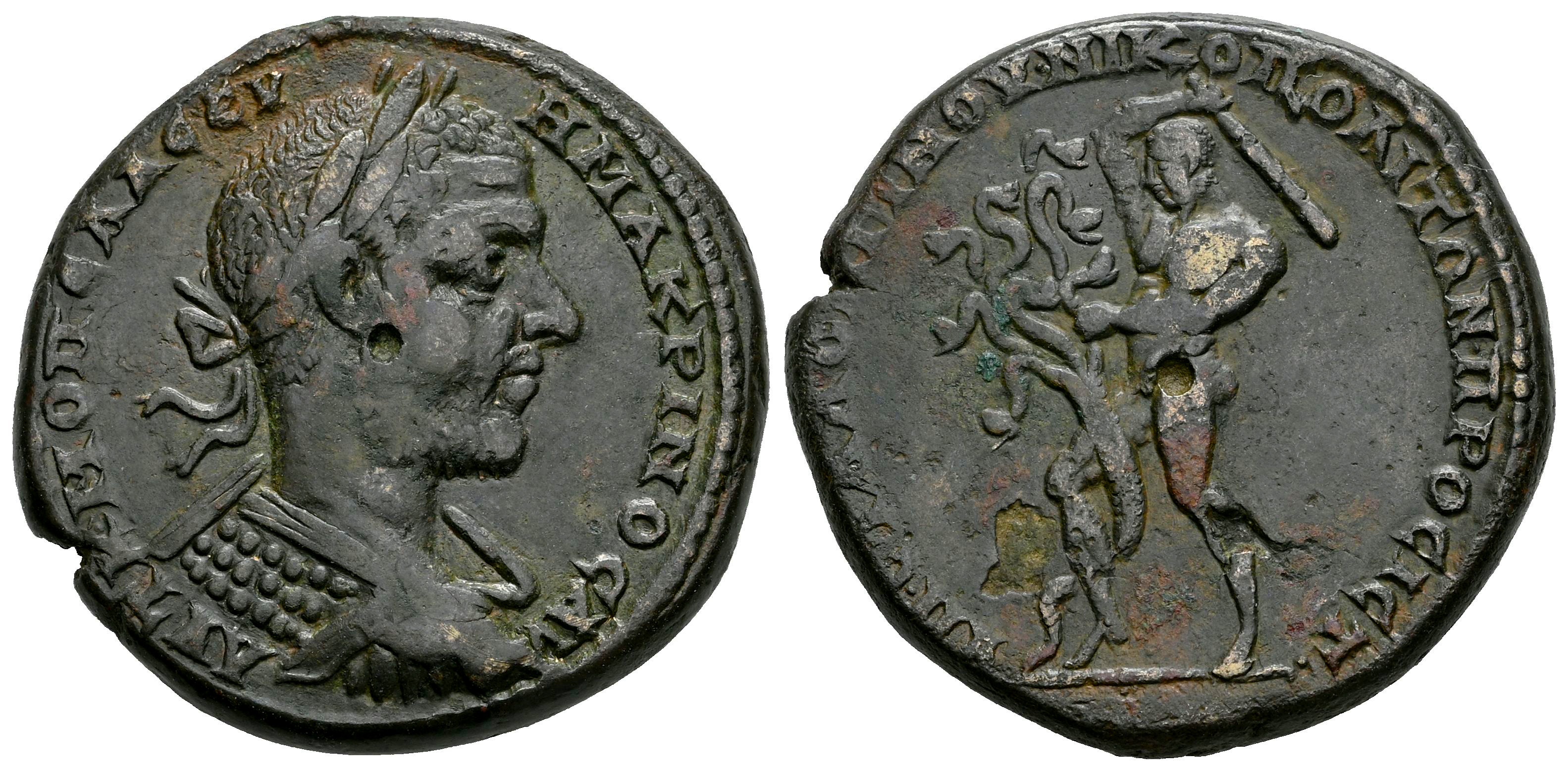 Macrinus. Moesia Inferior. AE 27. 217-218 AD. Nicopolis ad Istrum. Statius Longinus, consular legate. (AMNG-I 1760). (Varbanov-2741). (Tesorillo-Macrino 3, Plate Coin). Anv.: AVT K M OΠEΛΛ CEVH MAKΡINOC C AV. Laureate and cuirassed bust right. Rev.: VΠ CTA ΛONΓINOY NIKOΠOΛITΩN ΠΡOC ICT. Herakles standing left, raising club to strike Lernean Hydra. Ae. 14,62 g. Choice VF. Est...200,00.