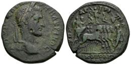Macrinus. Moesia Inferior. AE 26. 217-218 AD. Nicopolis ad Istrum. Marcus Claudius Agrippa, consular legate. (Varbanov-3407 var.). (AMNG-1713). (Tesorillo-Macrino 4, Plate Coin). Anv.: AV K OΠΠEΛ CEVH MAKΡINOC. laureate head to right. Rev.: VΠ AΓΡIΠΠA NIKOΠOΛITΩN (ΠΡOC ICTΡΩ). emperor being crowned by Nike in triumphal quadriga to right, led by soldier holding vexillum; in upper field, trophy with two seated captives at base, two small figures on horses' backs. Ae. 11,95 g. Rare. Ex Ancient Delights, at the present Mayor 25. Madrid Numismatic convention (May 2009). Almost VF/VF. Est...200,00.