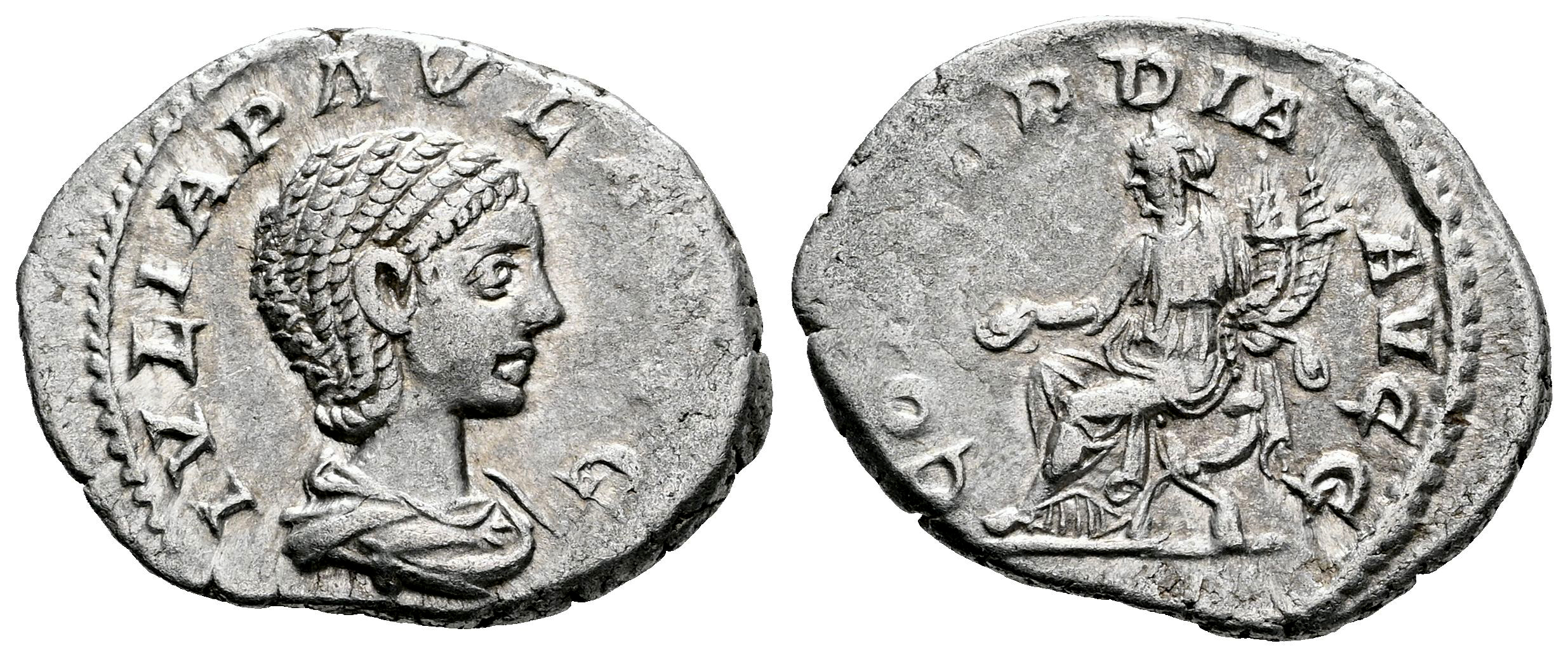 Julia Paula. Denarius. 219-220 AD. Rome. (Ric-IV 216). (Bmcre-321). (Tesorillo-J. Paula 2, Plate Coin). Anv.: IVLIA PAVLA AVG, draped bust right. Rev.: CONCORDIA AVGG, Concordia seated left, holding patera and double cornucopiae. Ag. 3,15 g. Ex Ancient Delights, at the present Mayor 25. (November 2004). Choice VF. Est...120,00.