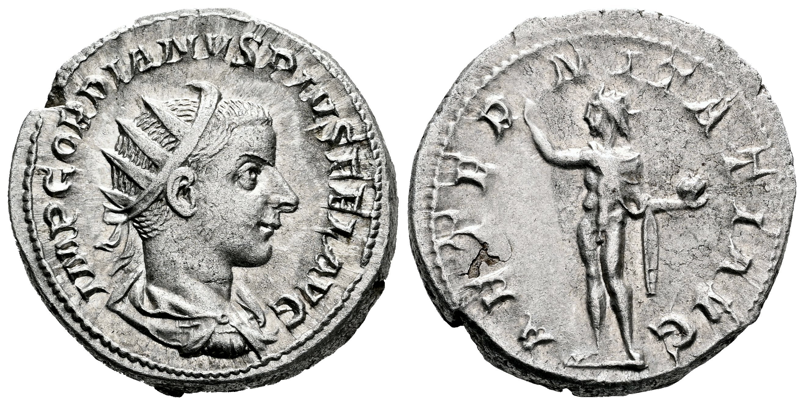 Gordian III. Antoninianus. 241-243 AD. Rome. (Ric-IV 83). (Rsc-41). (Tesorillo-Gordiano III 13, Plate Coin). Anv.: IMP GORDIANVS PIVS FEL AVG, radiate, draped and cuirassed bust to right. Rev.: AETERNITATI AVG, Sol standing to left, raising hand and holding globe. Ag. 5,45 g. Ex Ancient Delights, at the present Mayor 25. Madrid Numismatic convention (February 2004). Almost XF/Choice VF. Est...60,00.