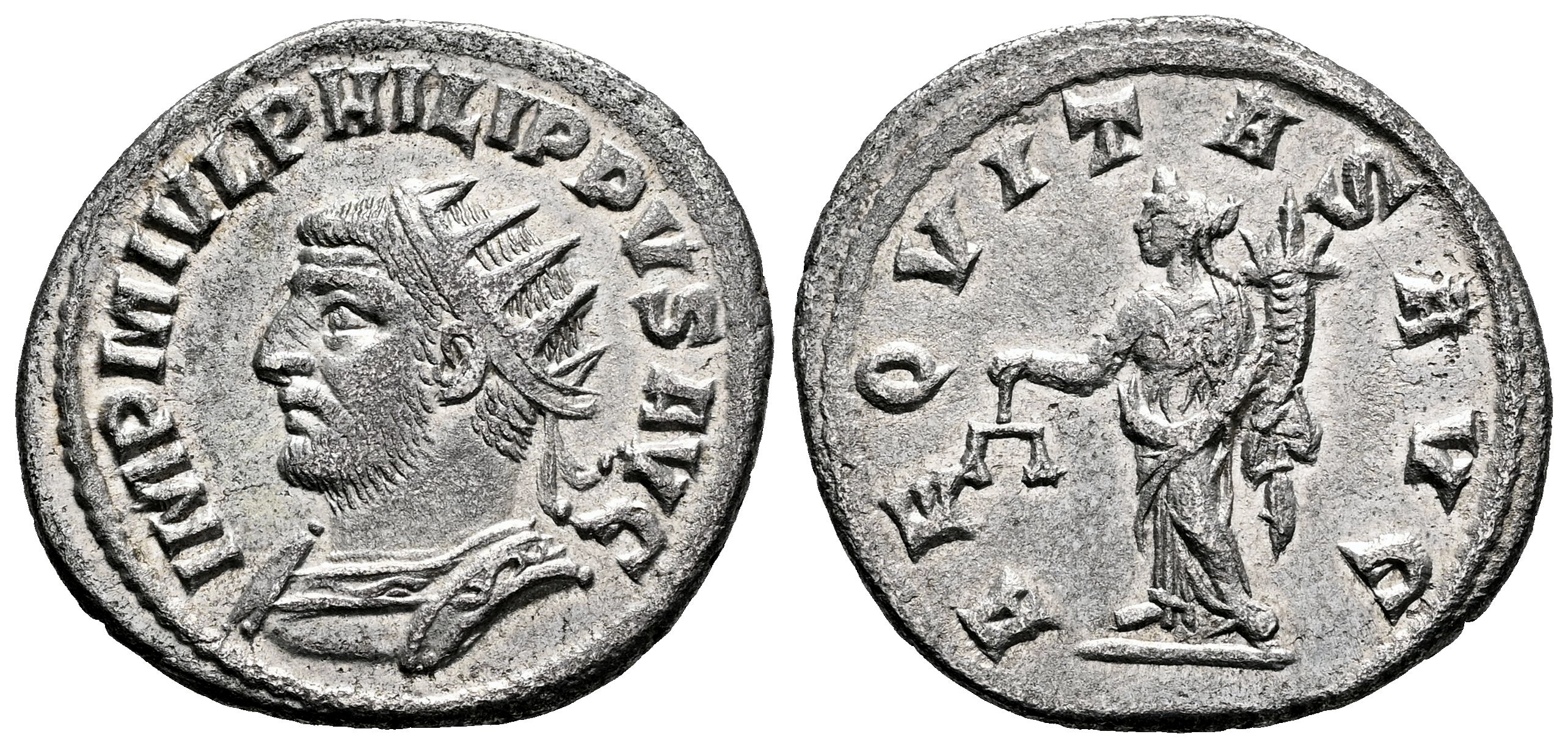 Philip I. Antoninianus. 244-247 AD. Antioch. (Ric-IV 82b var.). (Rsc-8 var.). (Tesorillo-Filipo I 4, Plate Coin). Anv.: IMP M IVL PHILIPPVS AVG, radiate and cuirassed bust to left. Rev.: AEQVITAS AVG, Aequitas standing facing, head to left, holding scales and cornucopiae. Ag. 3,76 g. Choice VF. Est...100,00.