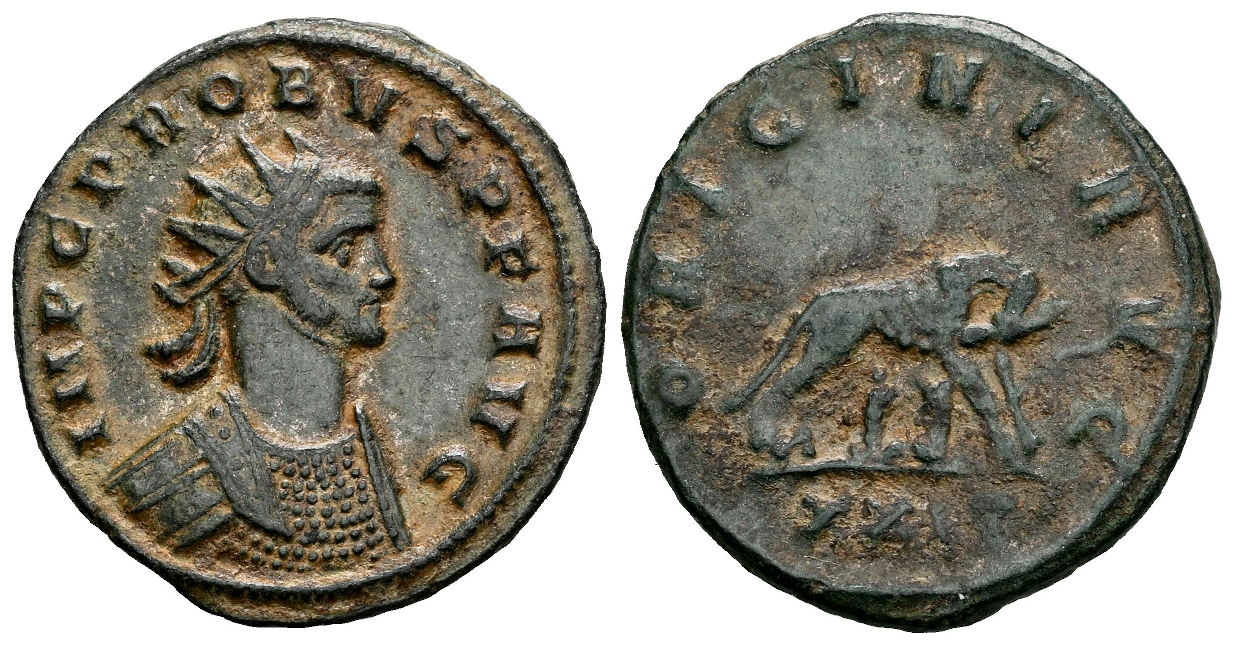 Probus. Antoninianus. 276-282 AD. Siscia. (Ric-V 2 703). (Tesorillo-Probo 15, Plate Coin). Anv.: IMP C PROBVS P F AVG, radiate and cuirassed bust to right. Rev.: ORIGINI AVG, she-wolf standing to right, suckling Romulus and Remus; XXIT in exergue. Bi. 3,56 g. Green patina. Ex Beast Coins, Vcoins (December 2008). Included original label. Choice VF/VF. Est...100,00.