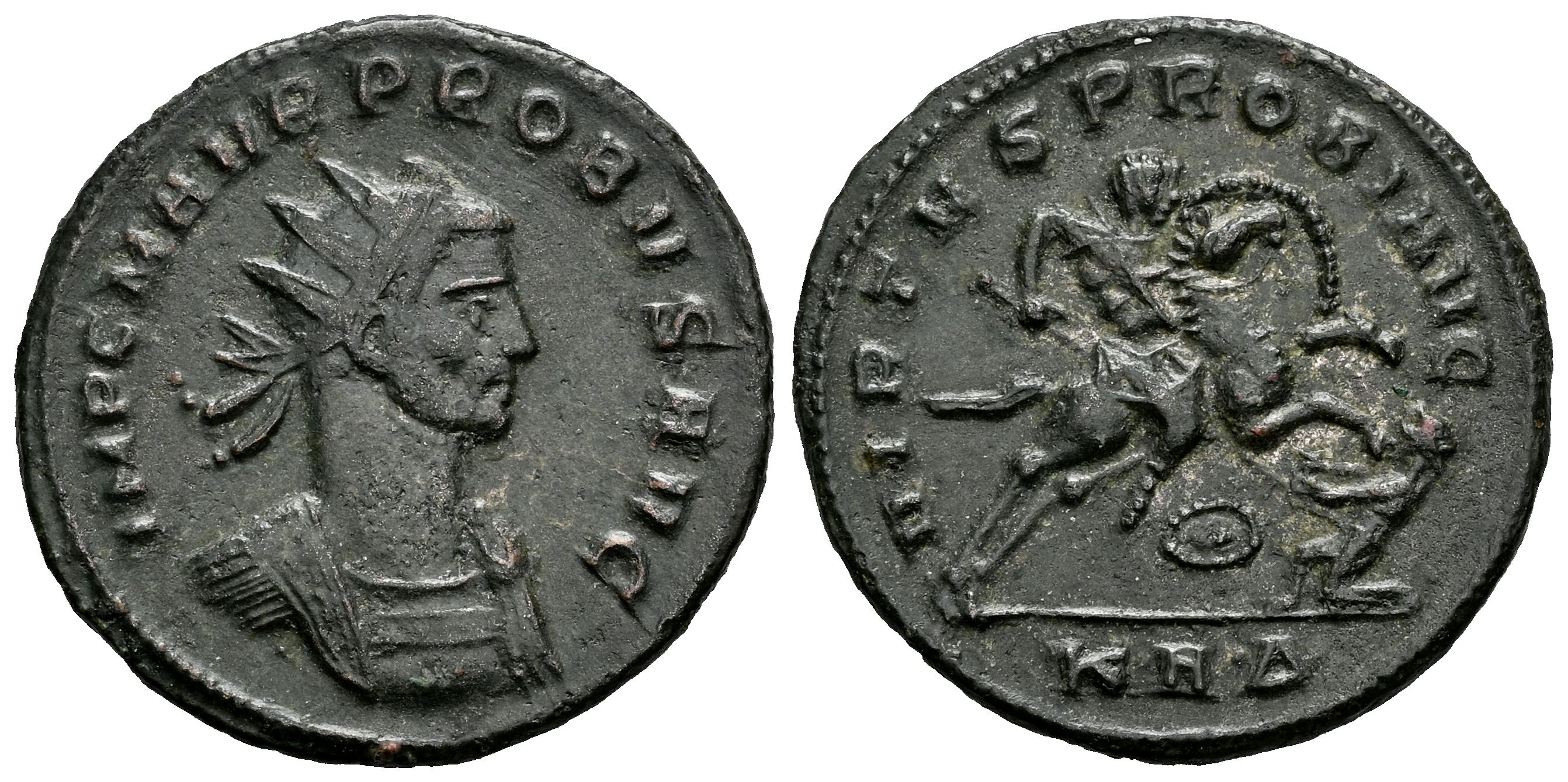 Probus. Antoninianus. 276-282 AD. Serdica. (Ric-V 2 878). (Tesorillo-Probo 36, Plate Coin). Anv.: IMP C M AVR PROBVS AVG, radiate and cuirassed bust to right. Rev.: VIRTVS PROBI AVG, emperor on horse galloping to right, holding shield and spearing enemy who falls backward with arms upraised, dropping shield below horse; KAΔ in exergue. Ae. 4,21 g. Ex Nemesis Antients & Antiquies, Vcoins (December 2008). Included original label. VF/Choice VF. Est...60,00.