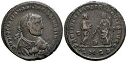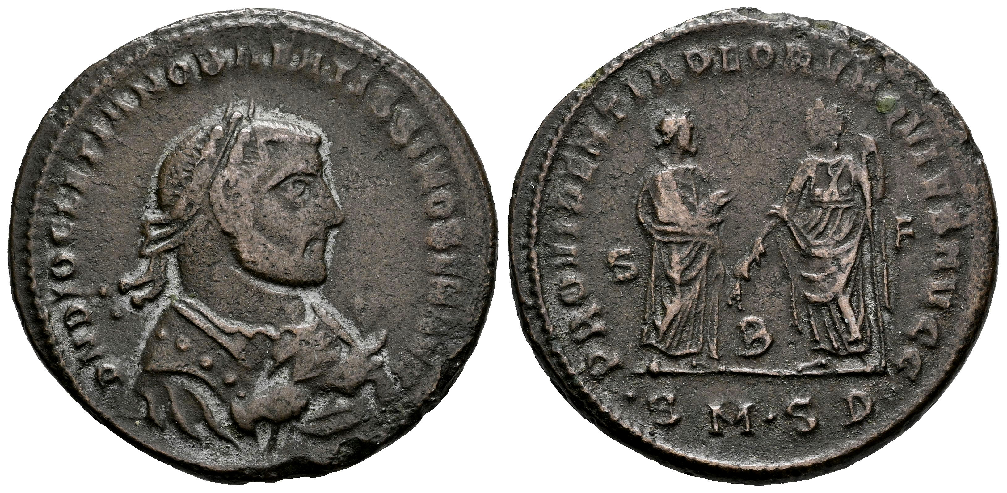 Diocletian. Follis. 305-306 AD. Serdica. (Ric-VI 14a). (C-422). (Tesorillo-Diocleciano 23, Plate Coin). Anv.: D N DIOCLETIANO BAEATISSIMO SEN AVG. Laureate bust to right, wearing imperial mantle and holding olive branch in his right hand and mappa in his left. Rev.: PROVIDENTIA DEORVM QVIES AVGG. Providentia standing right, extending her right hand to Quies, standing left, holding branch in her right hand and long scepter in her left; S - F / B across fields, •SM•SD• in exergue. Ae. 9,00 g. Ex J. Vico 140 (06/11/2014), lot 119. Almost VF. Est...50,00.