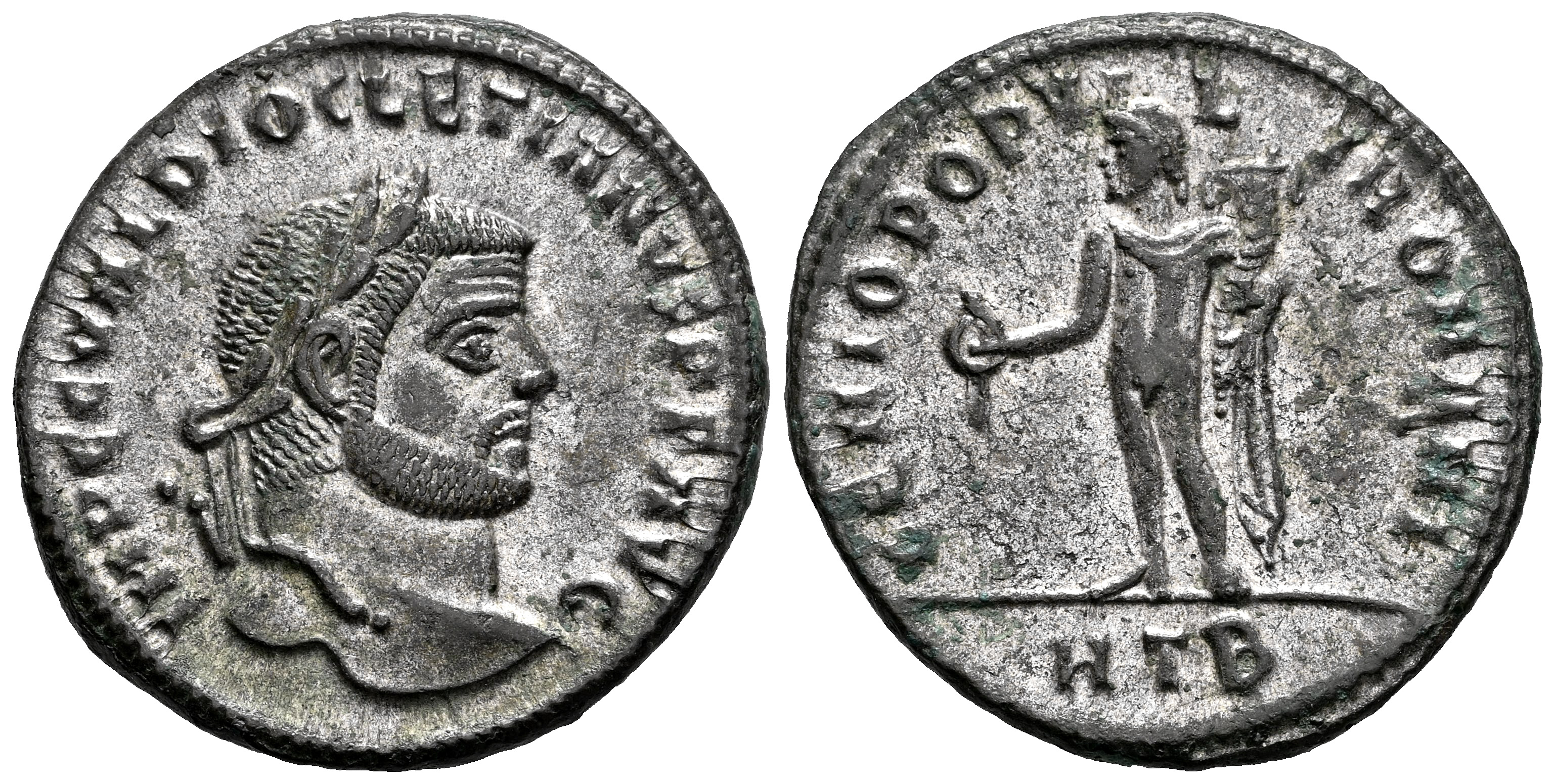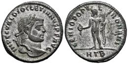 Diocletian. Follis. 296-297 AD. Heraclea. (Ric-VI 17a). (C-106). (Tesorillo-Diocleciano 15, Plate Coin). Anv.: IMP C C VAL DIOCLETIANVS P F AVG, laureate head to right. Rev.: GENIO POPVLI ROMANI, Genius standing to left, modius on head, holding patera, from which liquid flows, and cornucopiae; HTB in exergue. Bi. 8,30 g. Ex Ancient Delights, at the present Mayor 25. (Enero 2004). AU/XF. Est...80,00.