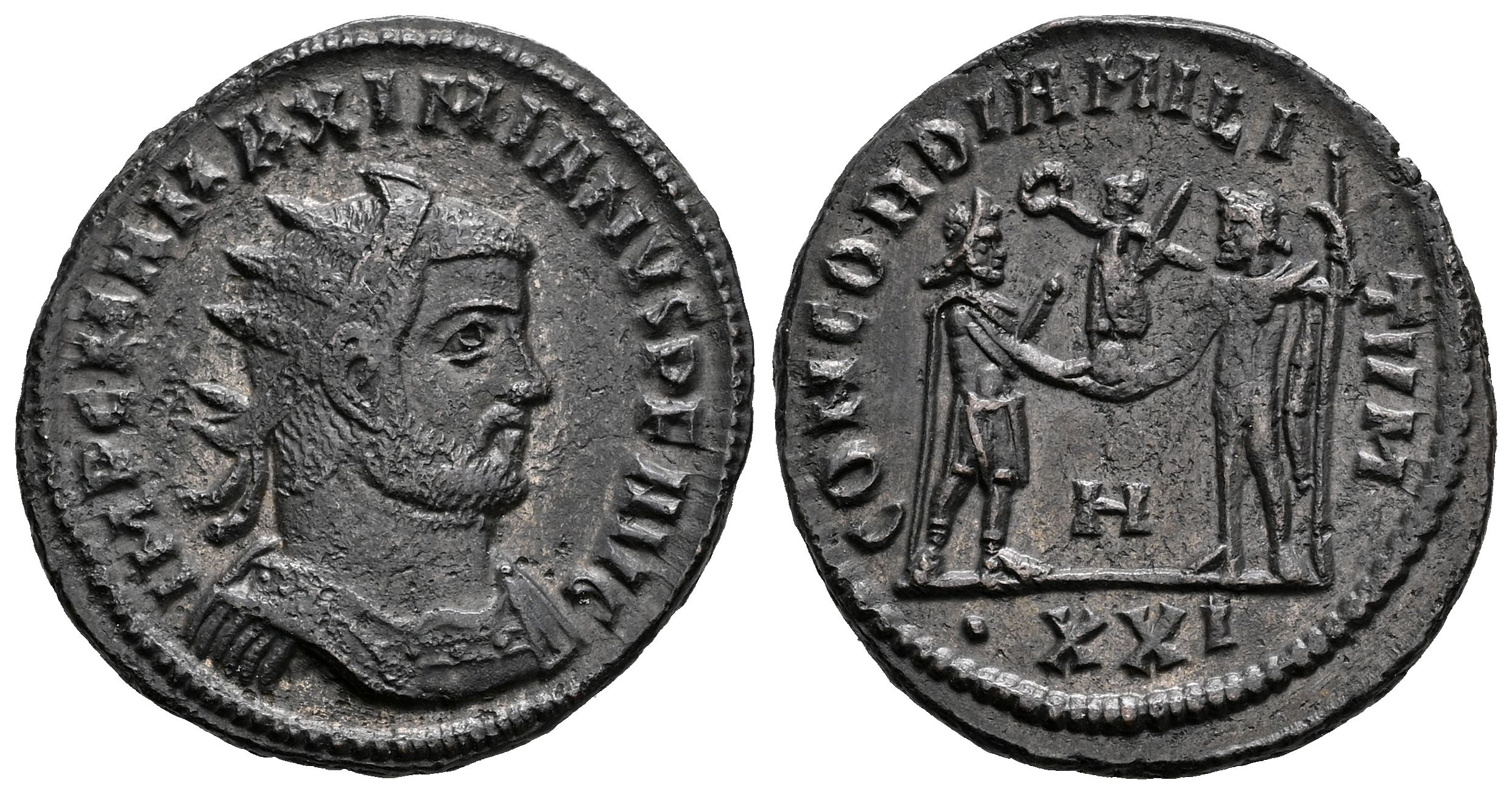 Maximianus Herculius. Antoninianus. 293 AD. Antioch. (Ric-V 2 621). (C-54). (Tesorillo-M. Hércules 4, Plate Coin). Anv.: IMP C M A MAXIMIANVS P F AVG, radiate and cuirassed bust to right. Rev.: CONCORDIA MILITVM, emperor standing facing, head to right, holding sceptre and receiving Victory on globe from Jupiter standing to left and holding sceptre; H between, •XXI in exergue. Bi. 3,93 g. Ex Ancient Delights, at the present Mayor 25. (September 2005). VF/Choice VF. Est...45,00.