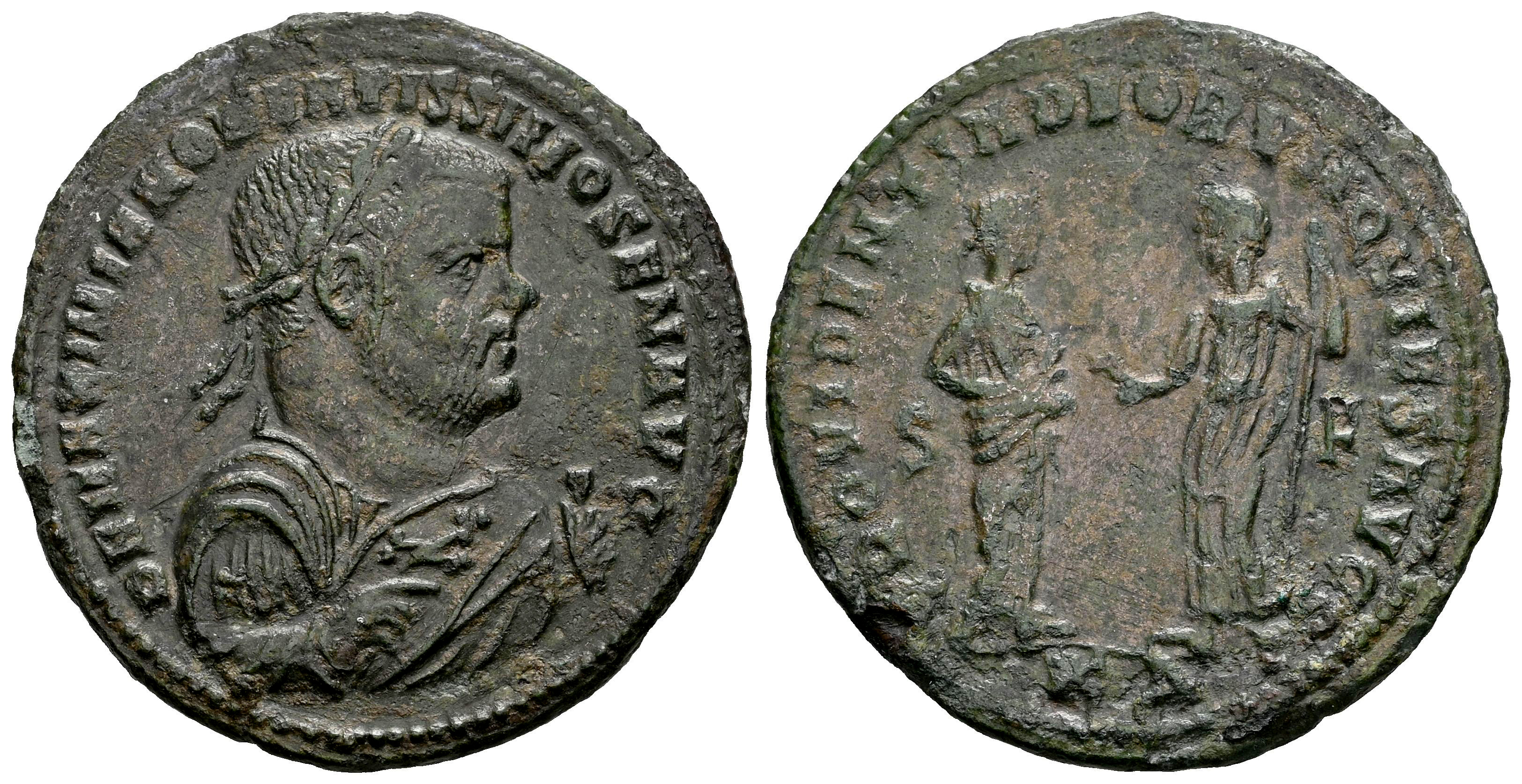 Maximianus Herculius. Follis. 307 AD. Cyzicus. (Ric-VI 32b). (C-492). (Tesorillo-M. Hércules 19, Plate Coin). Anv.: D N MAXIMIANO FELICISSIMO SEN AVG, laureate bust to right, wearing imperial mantle, holding branch and mappa. Rev.: PROVIDENTIA DEORVM QVIES AVG, Providentia standing to right, extending hand to Quies standing to left, holding branch and sceptre; S-F across fields, KΔ in exergue. Bi. 6,88 g. Scarce. Ex Ancient Delights, at the present Mayor 25. Madrid Numismatic convention (March 2006). VF/Almost VF. Est...70,00.