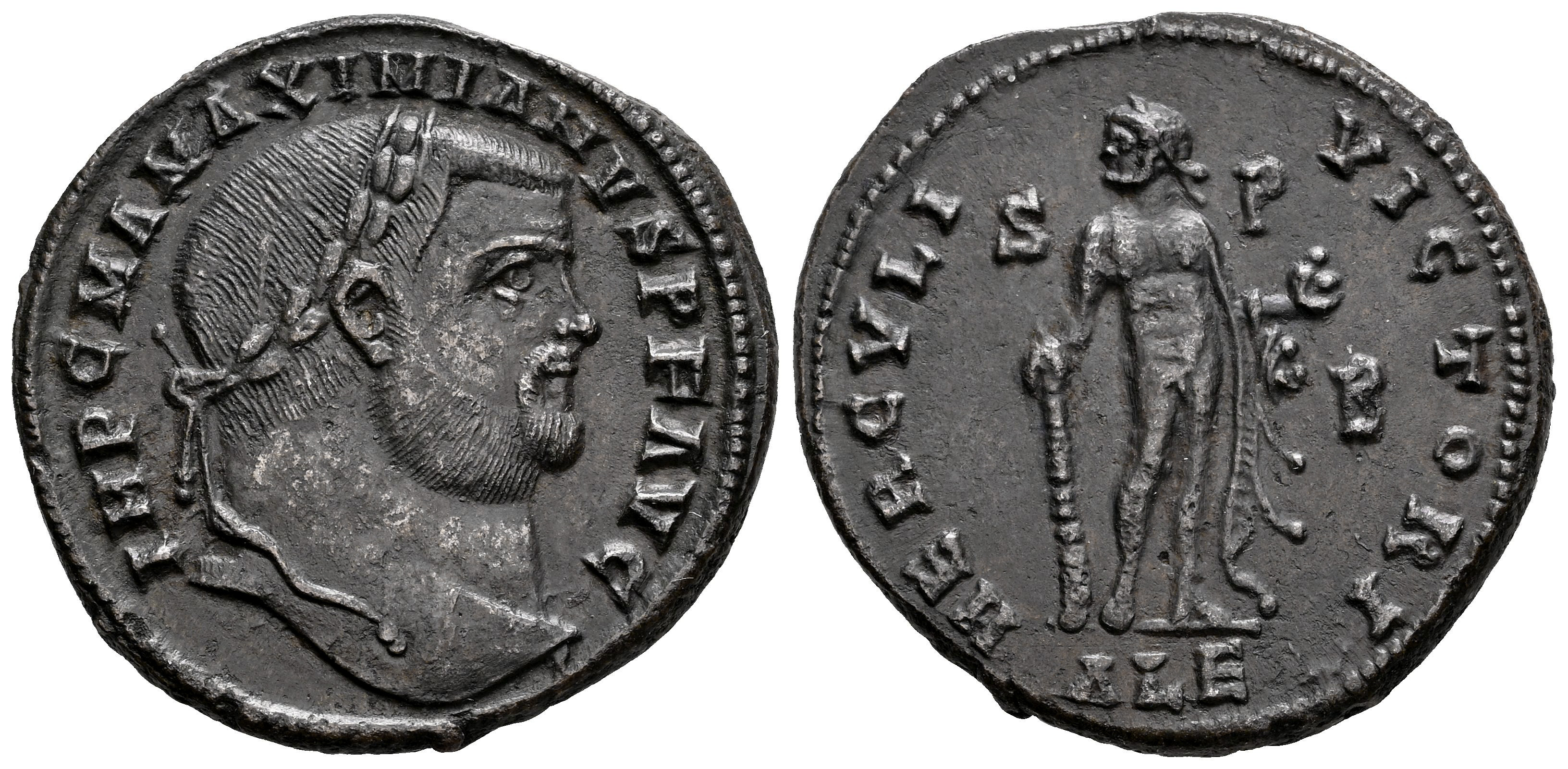 Maximianus Herculius. Follis. 285-310 AD. Alexandria. (Ric-VI 38). (Tesorillo-M. Hércules 13, Plate Coin). Anv.: IMP C M A MAXIMIANVS P F AVG, laureate bust to right. Rev.: HERCVLI VICTORI, Hercules standing facing, head left, leaning right on club, left hand holding apples and with lions skin dropping from elbow; S-P across fields, B in right field, ALE in exergue. Ae. 9,95 g. Scarce. Ex Ancient Delights, at the present Mayor 25. Madrid Numismatic convention (September 2006). Almost XF/Choice VF. Est...100,00.