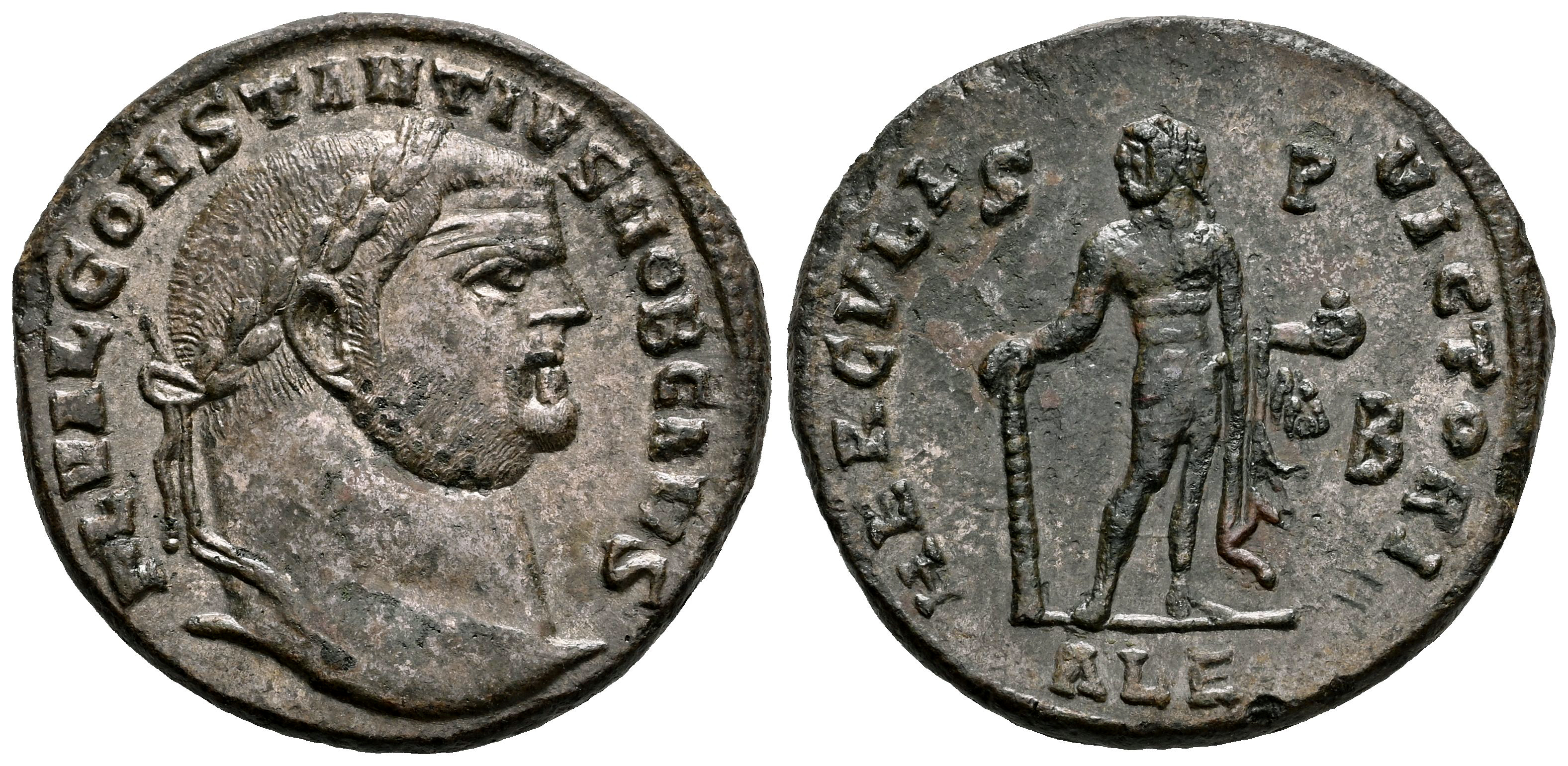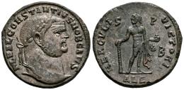 Maximianus Herculius. Follis. 304-305 AD. Alexandria. (Ric-VI 40). (Tesorillo-C. Cloro 7, Plate Coin). Anv.: FL VAL CONSTANTIVS NOB CAES, laureate head to right. Rev.: HERCVLI VICTORI, Hercules standing facing, head to left, leaning on club and holding apples; S in left field, P over B in right field, ALE in exergue. Bi. 8,76 g. Ex Ancient Delights, at the present Mayor 25. Madrid Numismatic convention (September 2006). Almost XF/Choice VF. Est...80,00.