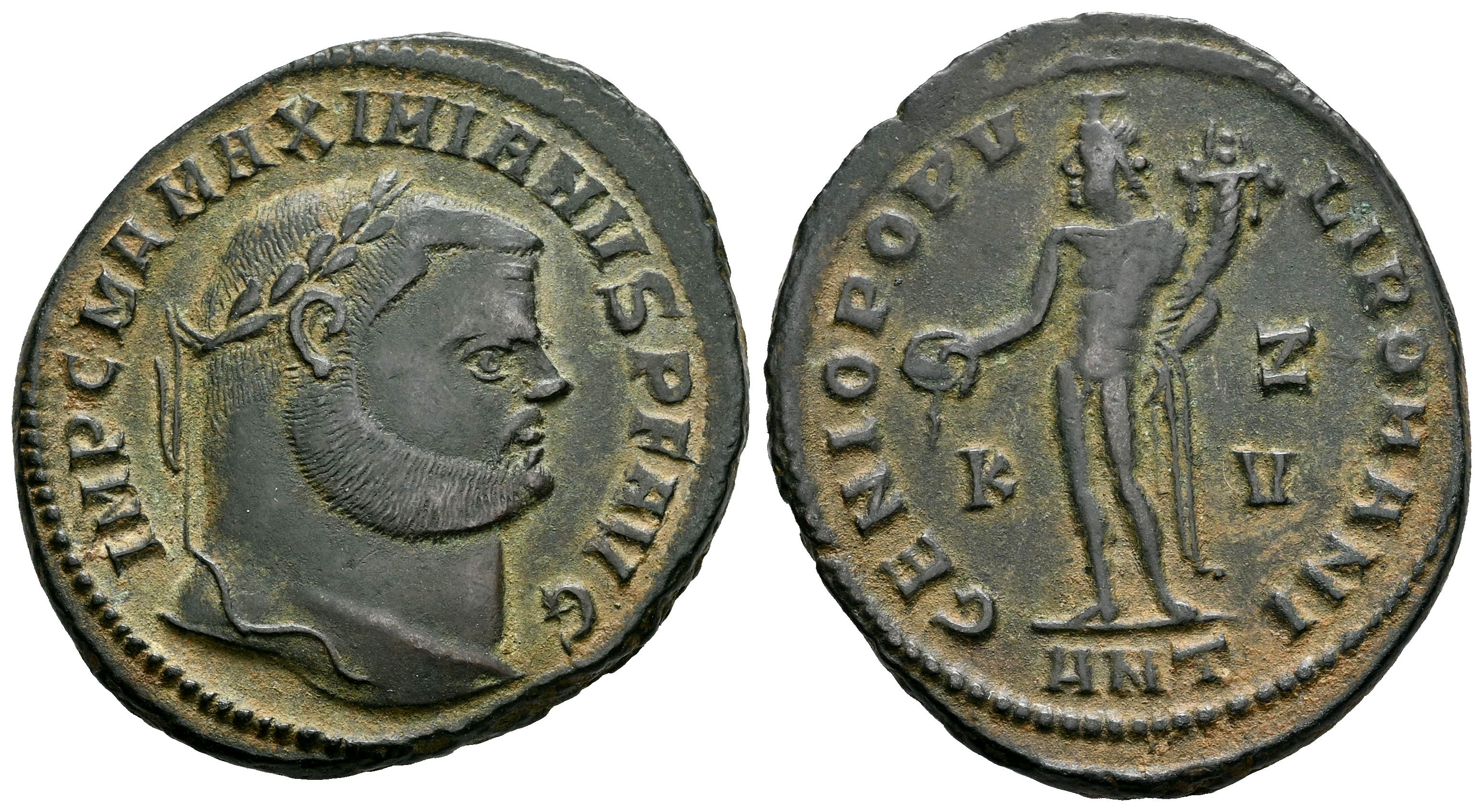 Maximianus Herculius. Follis. 300-301 AD. Antioch. (Ric-VI 54b). (C-184). (Tesorillo-M. Hércules 11, Plate Coin). Anv.: IMP C M A MAXIMIANVS P F AVG, laureate head to right. Rev.: GENIO POPVLI ROMANI, Genius, wearing modius on head, standing to left, holding cornucopiae and patera, from which liquor flows; K in left field, Z over V in right field, ANT in exergue. Ae. 9,51 g. Ex Ancient Delights, at the present Mayor 25. (July 2005). Almost XF/Choice VF. Est...70,00.