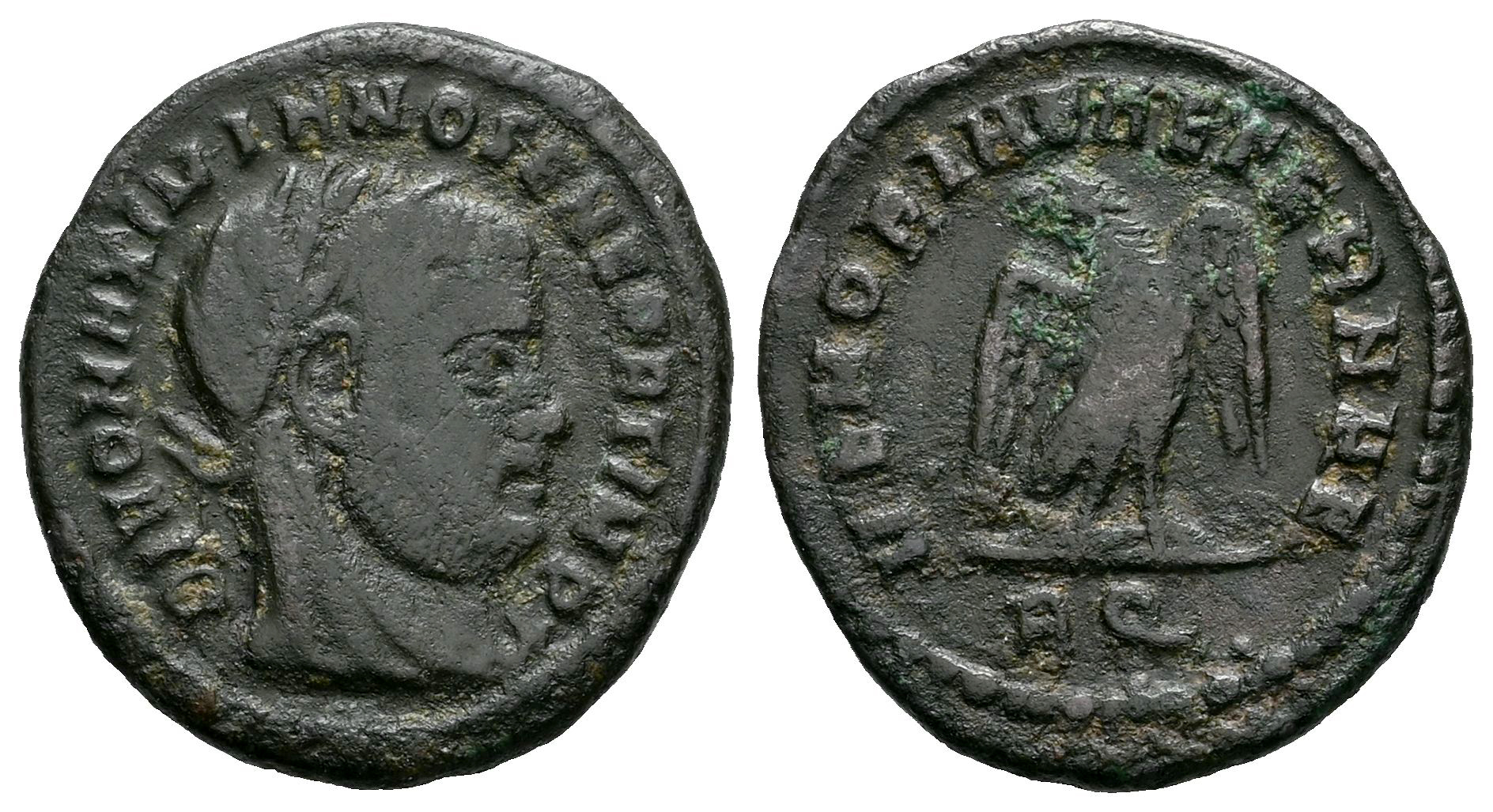Divus Maximianus. 1/2 follis. 317-318 AD. Rome. (Ric-VII 110). (C-397). (Tesorillo-M. Hércules 16, Plate Coin). Anv.: DIVO MAXIMIANO SEN FORT IMP, laureate and veiled head to right. Rev.: MEMORIAE AETERNAE, eagle standing to right, head and tail to left, with wings displayed; RQ in exergue. Ae. 2,15 g. Scarce. Ex Goert Boersema, Vcoins (October 2007). Almost VF. Est...60,00.