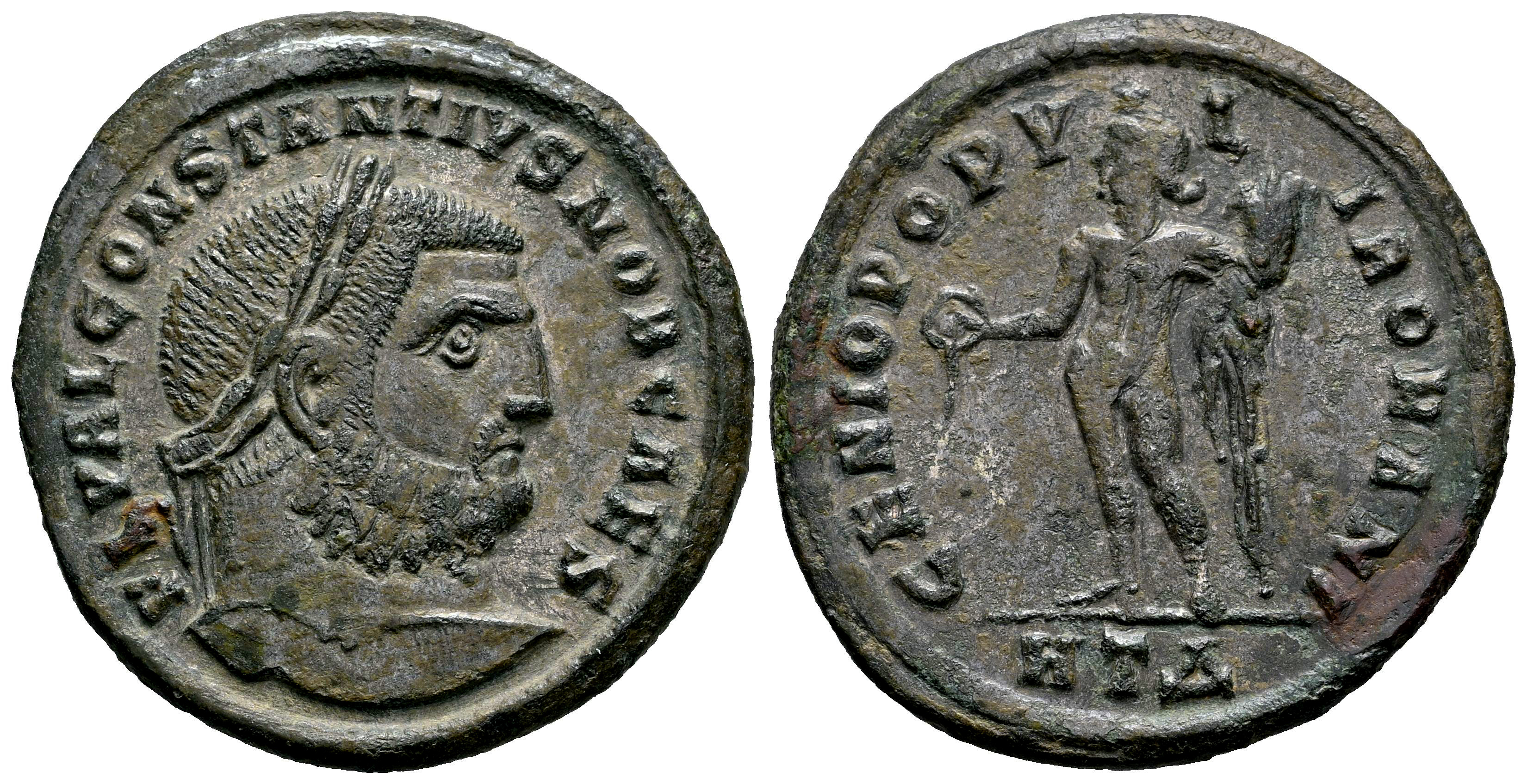 Constantius I Chlorus. Follis. 297-298 AD. Heraclea. (Ric-VI 20a). (Tesorillo-C. Cloro 5, Plate Coin). Anv.: FL VAL CONSTANTIVS NOB CAES, laureate head to right. Rev.: GENIO POPVLI ROMANI, Genius standing to left, modius on head, holding patera, from which liquid flows, and cornucopiae; HTΔ in exergue. Bi. 8,49 g. Choice VF. Est...80,00.